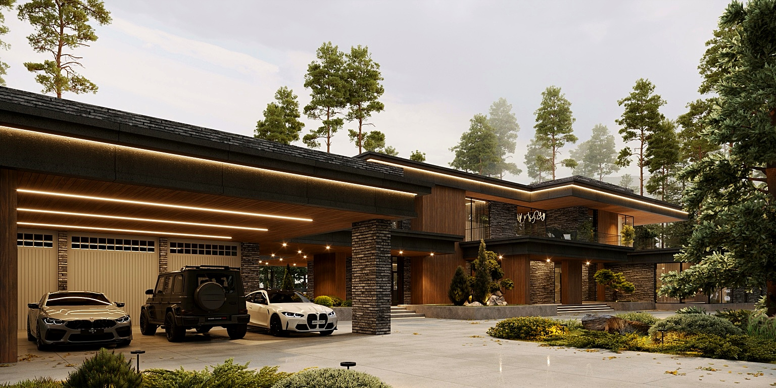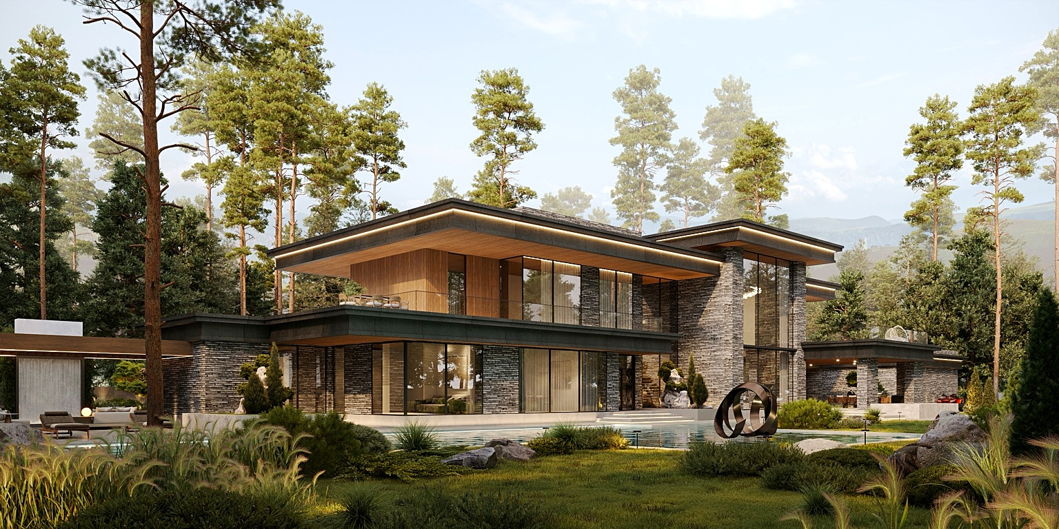Интерьер и экстерьер словно перетекают друг в друга: панорамное остекление открывает виды на сосновый лес и горные вершины, наполняя пространство светом и воздухом. Каждое решение, от фактуры фасада до геометрии террасы, продумано для того, чтобы подчеркнуть естественную красоту окружающей природы.