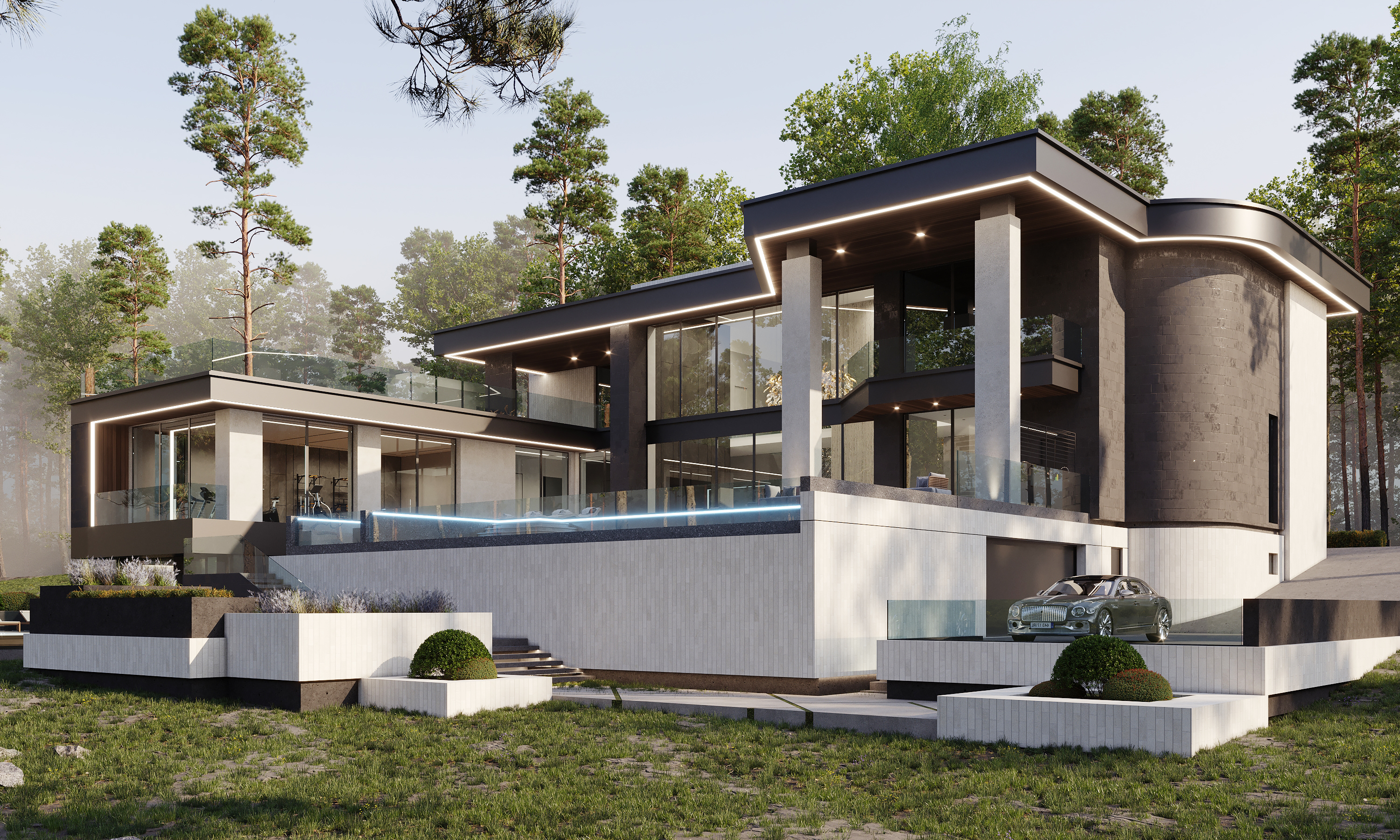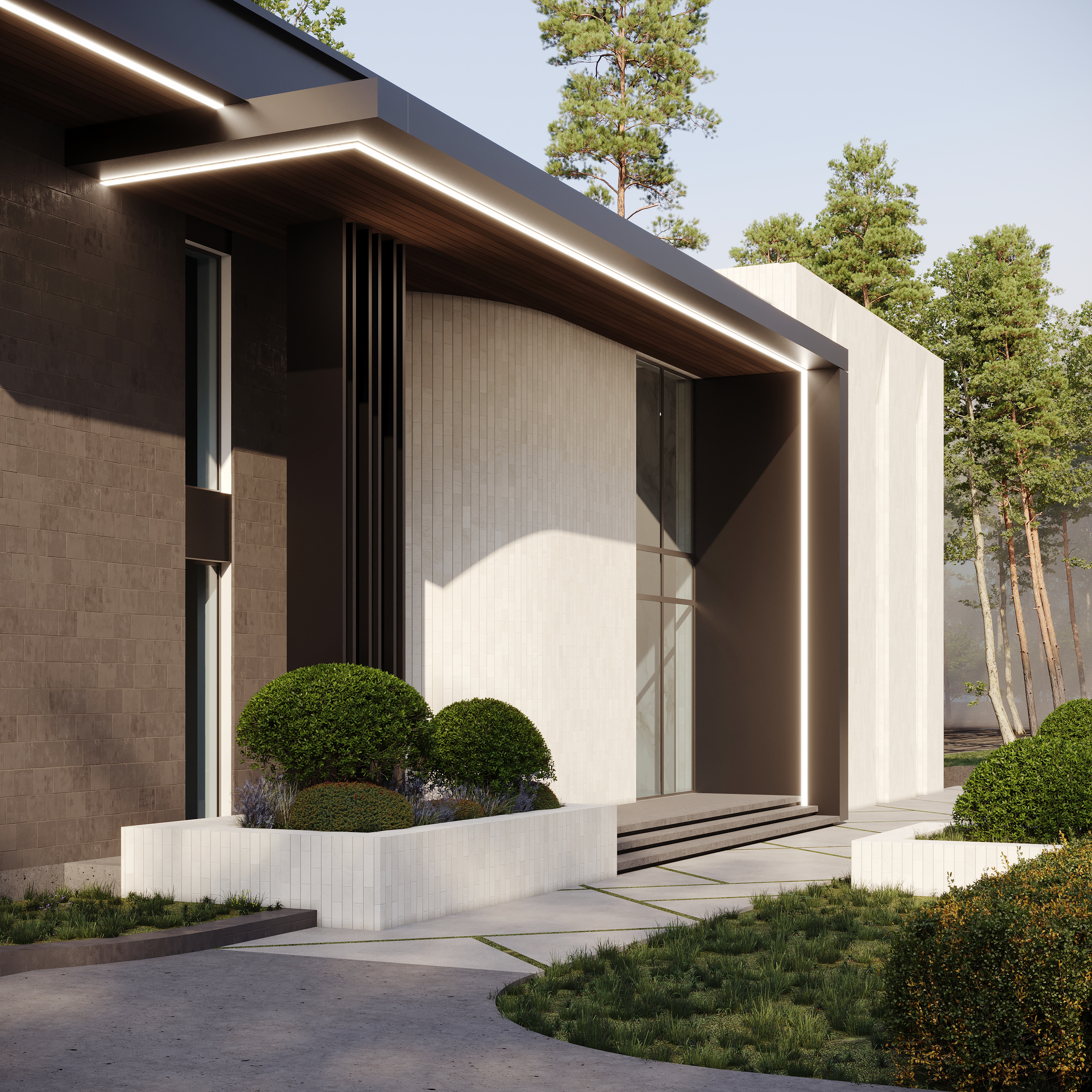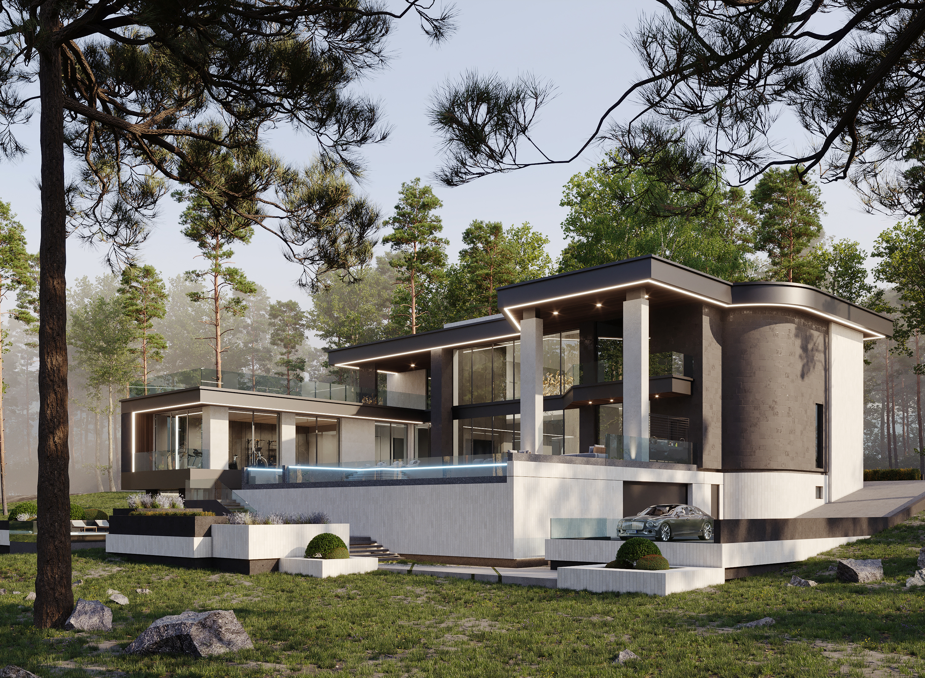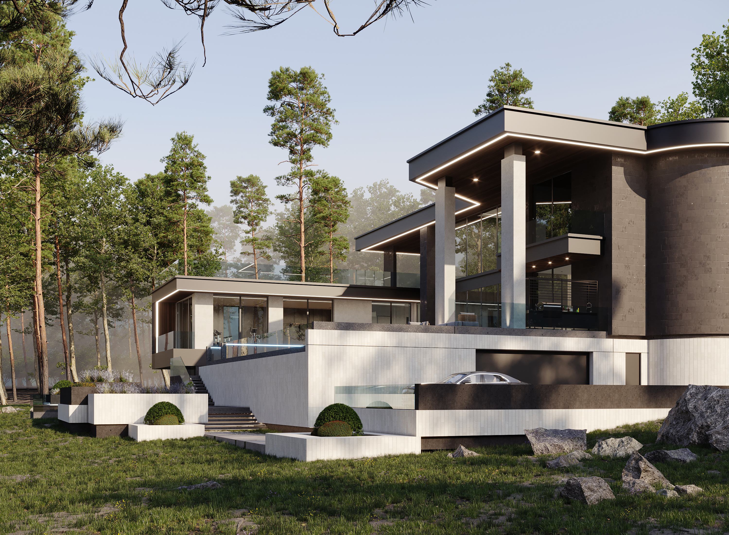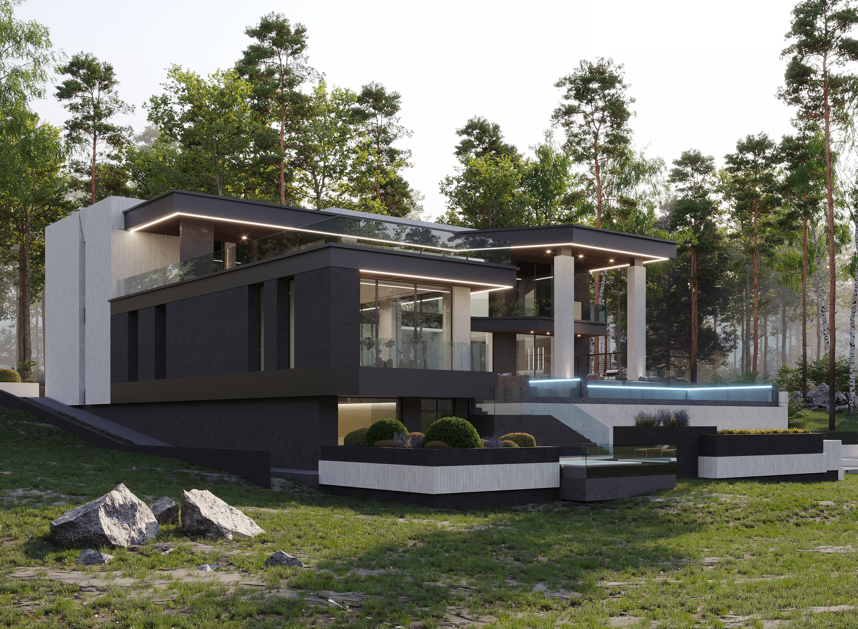 Фасад выполнен в сдержанной цветовой гамме: сочетание холодного серого камня, белых панелей и темных акцентов придает зданию утонченную элегантность. Благодаря стеклянным стенам интерьер буквально растворяется в ландшафте, позволяя природе стать частью архитектурного замысла.