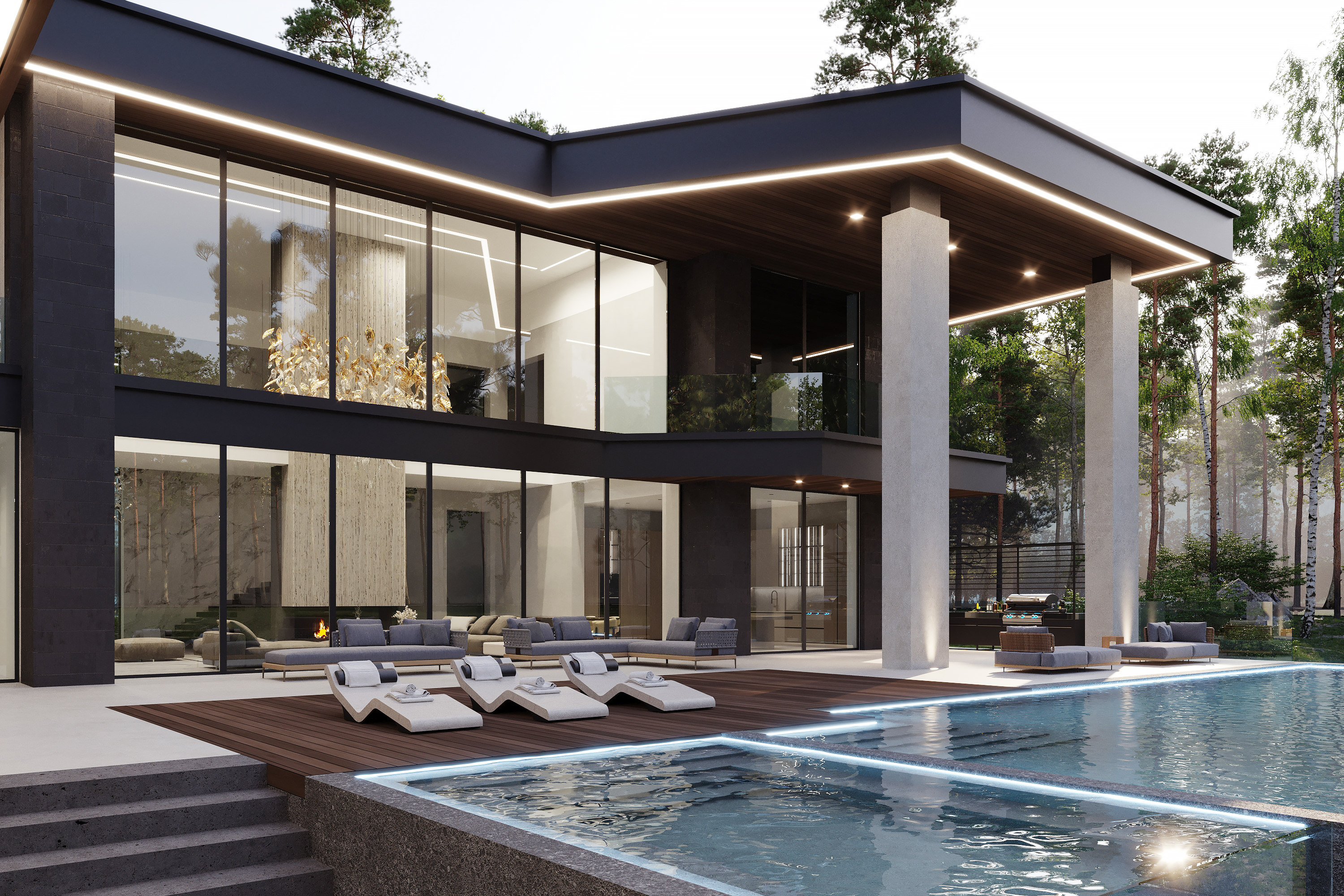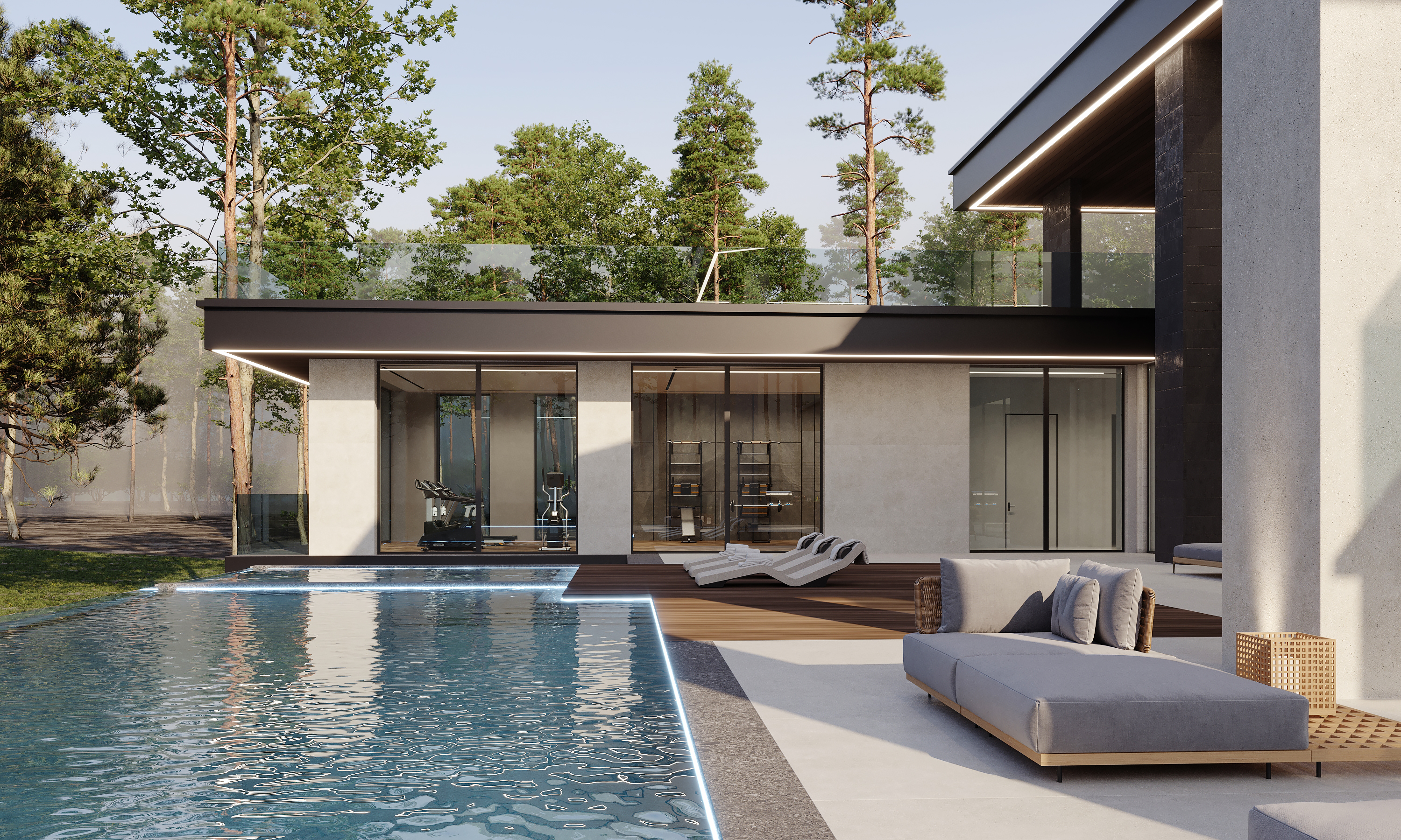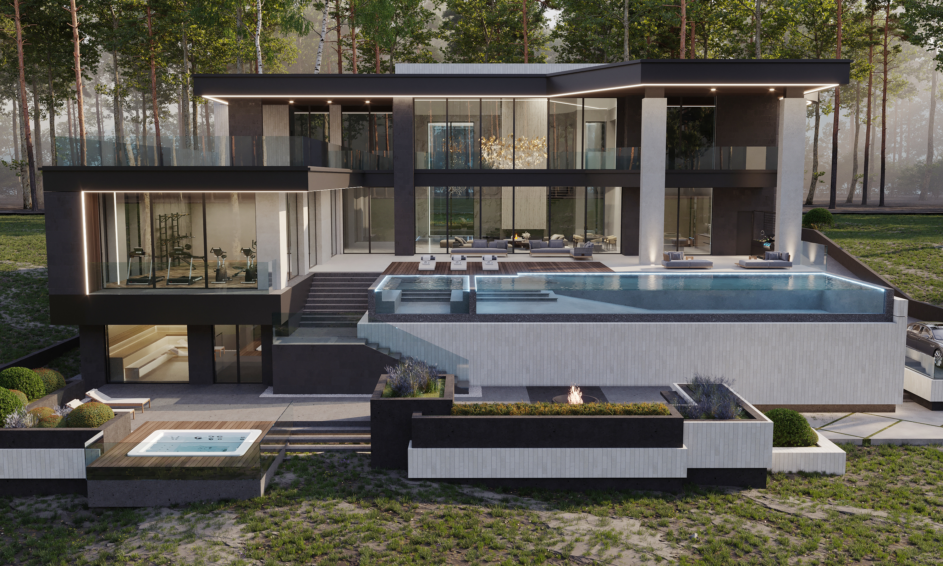 Центральным элементом композиции выступает просторная терраса с эффектным бесконечным бассейном, создающим визуальное продолжение горизонта. Уровневая организация территории обеспечивает плавный переход между зонами отдыха — от уютного спа-пространства и сауны до открытых лаундж-зон у воды.
