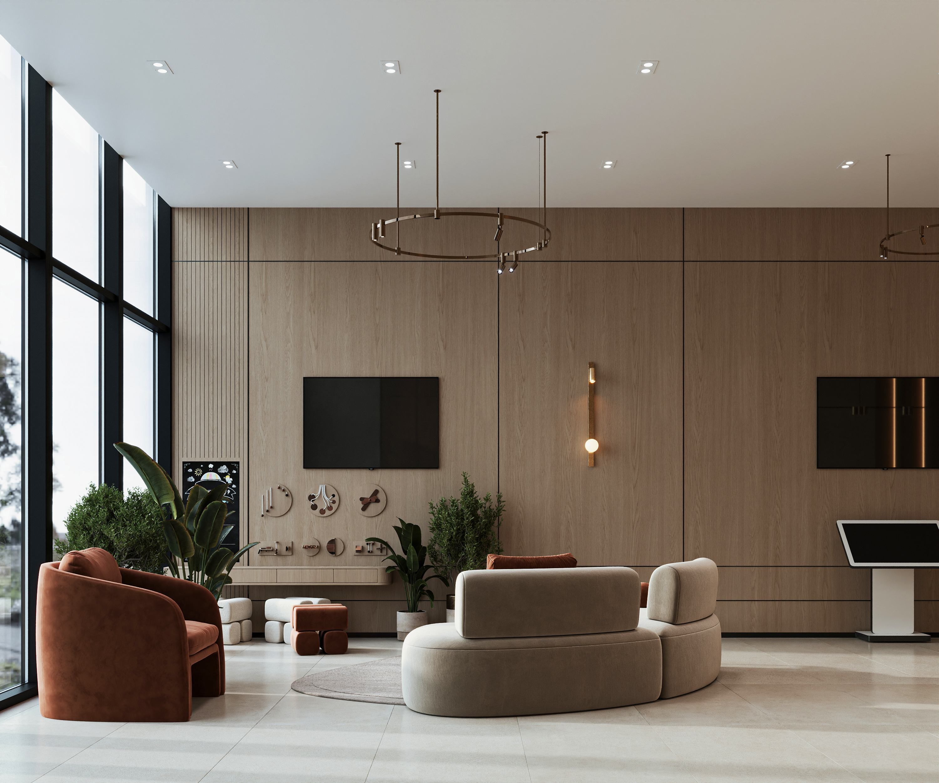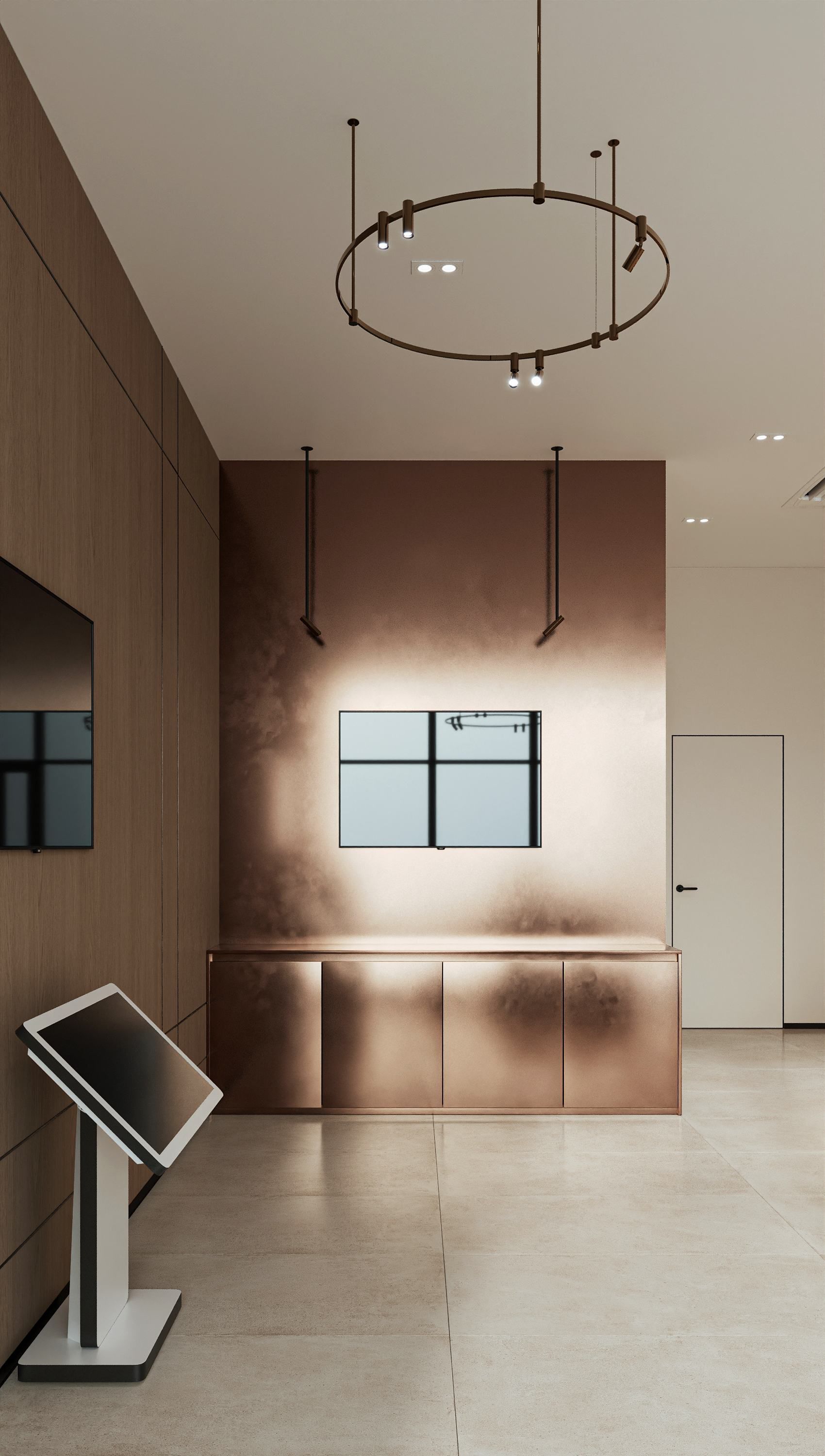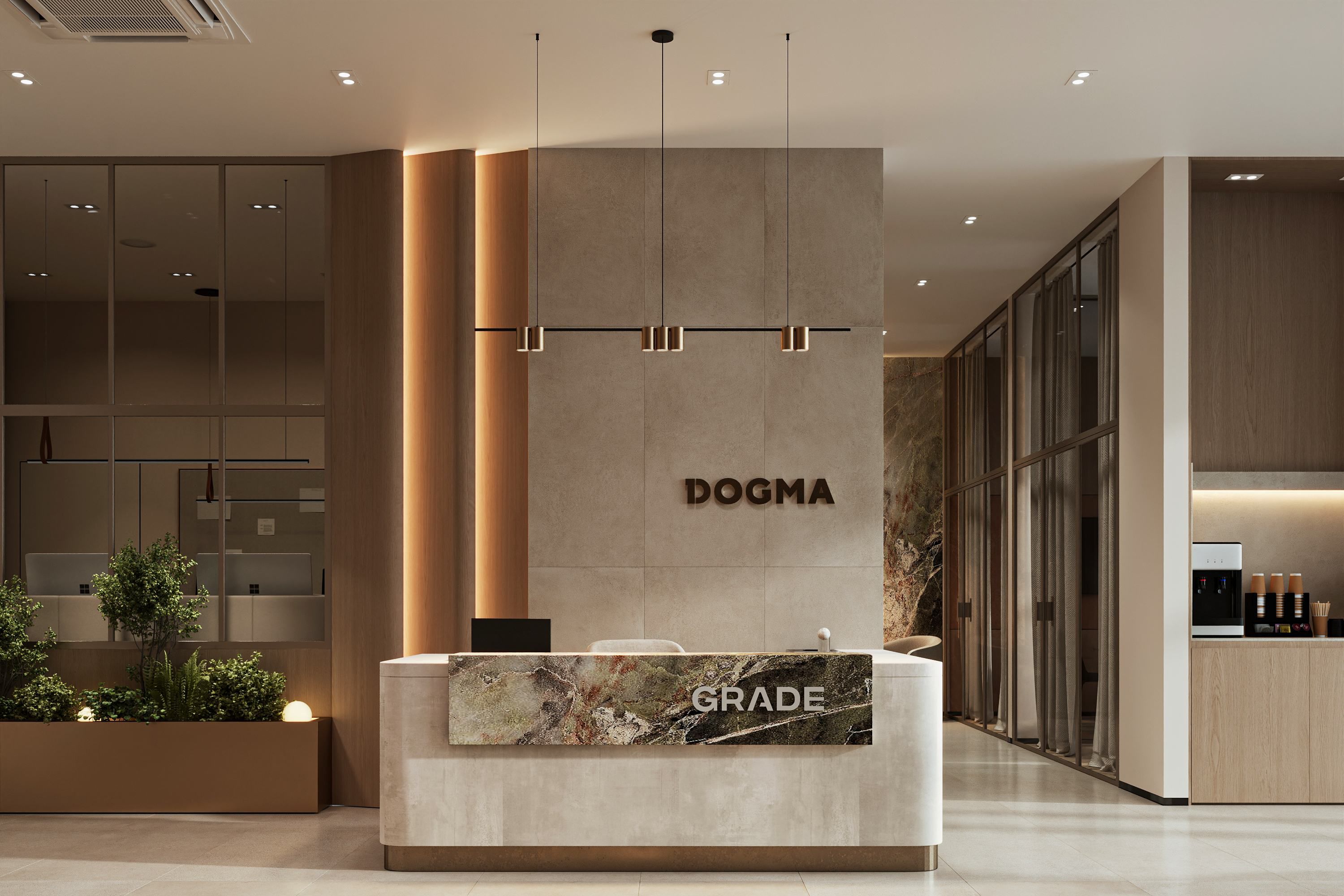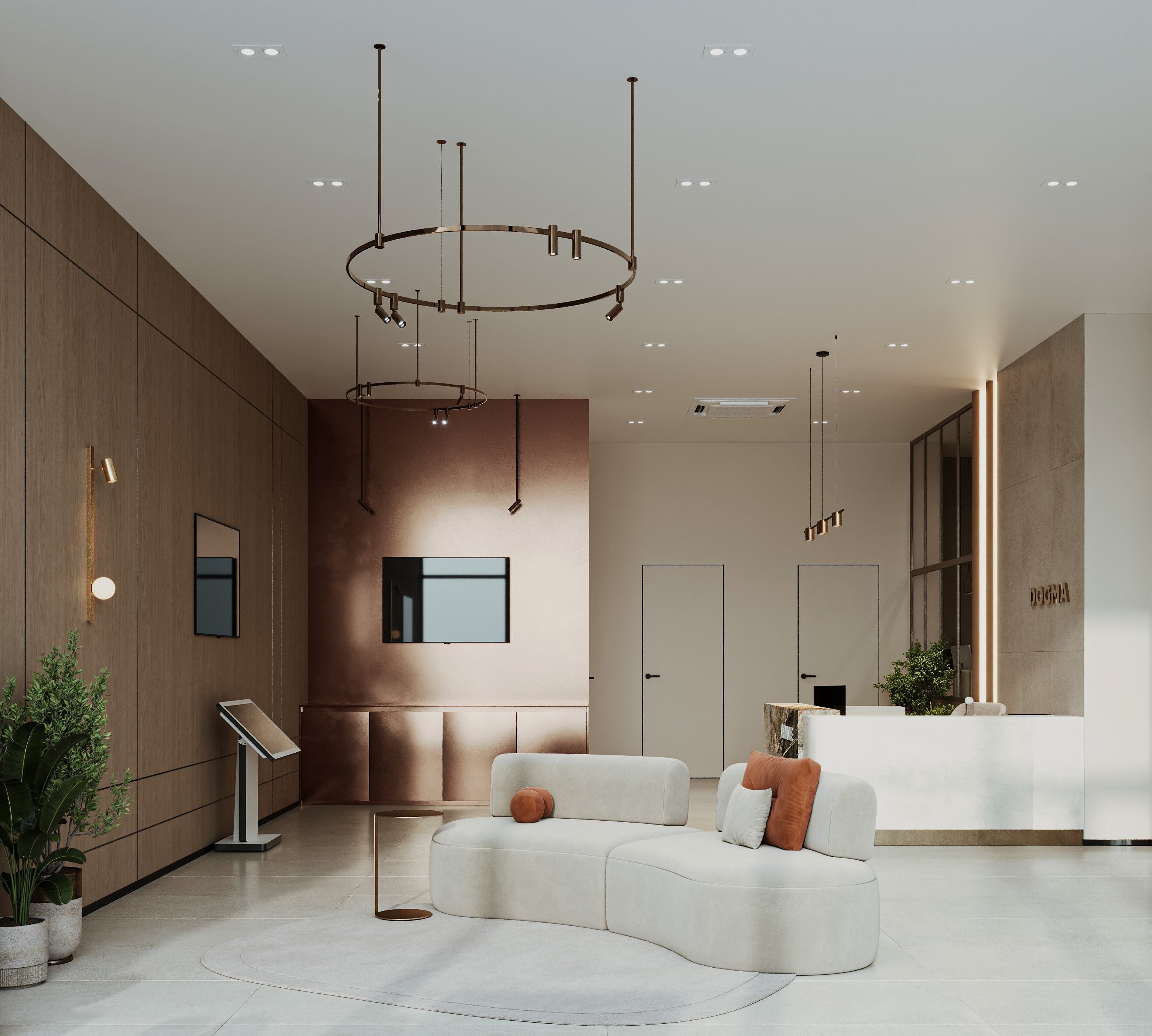 Отправной точкой концепции стал дизайн МОП ЖК «Грейд», где уже заложены черты минимализма и элементы айдентики компании. Это позволило создать визуальную преемственность между жилым комплексом и пространством офиса продаж. Сдержанная цветовая гамма дополнена акцентами терракотового оттенка в текстиле и металлизированными деталями, что придает интерьеру теплоту и характер, не нарушая общей лаконичности.