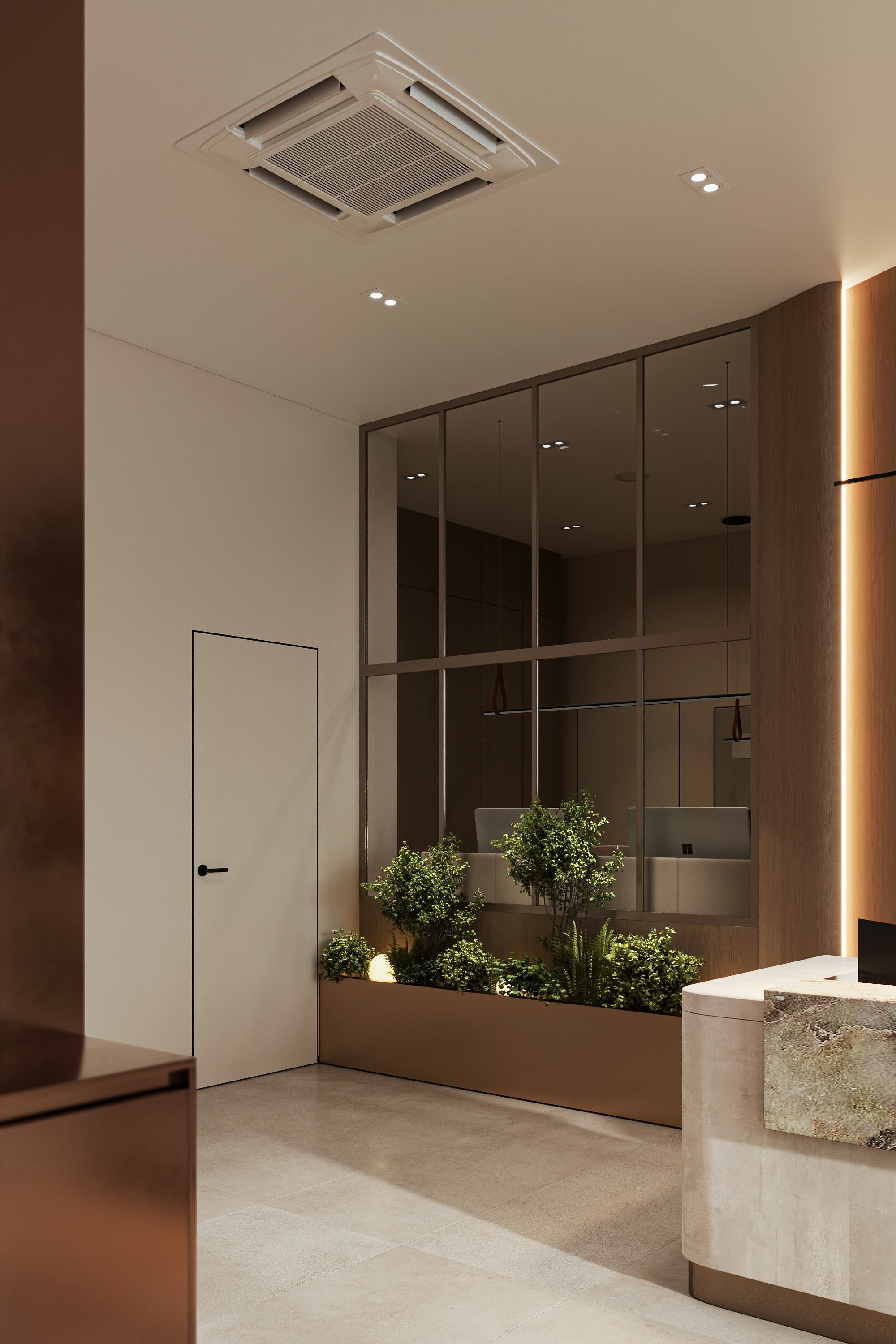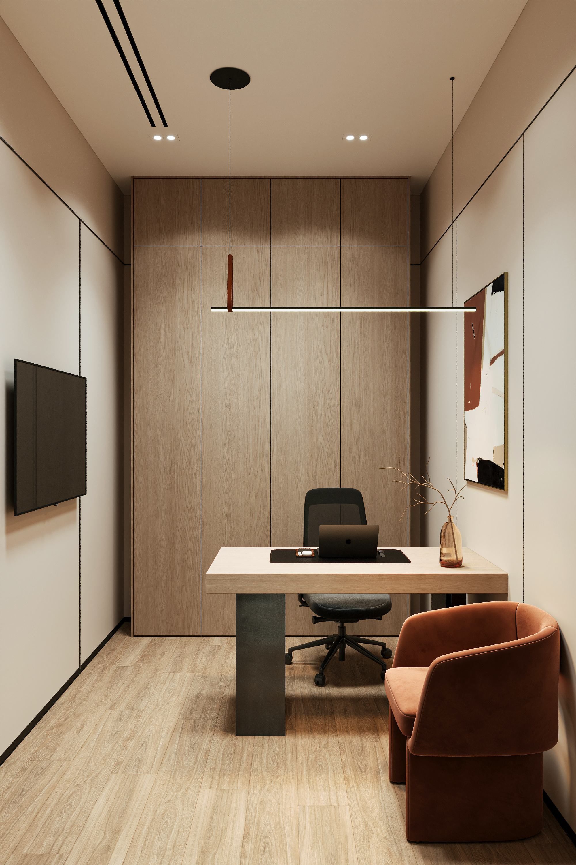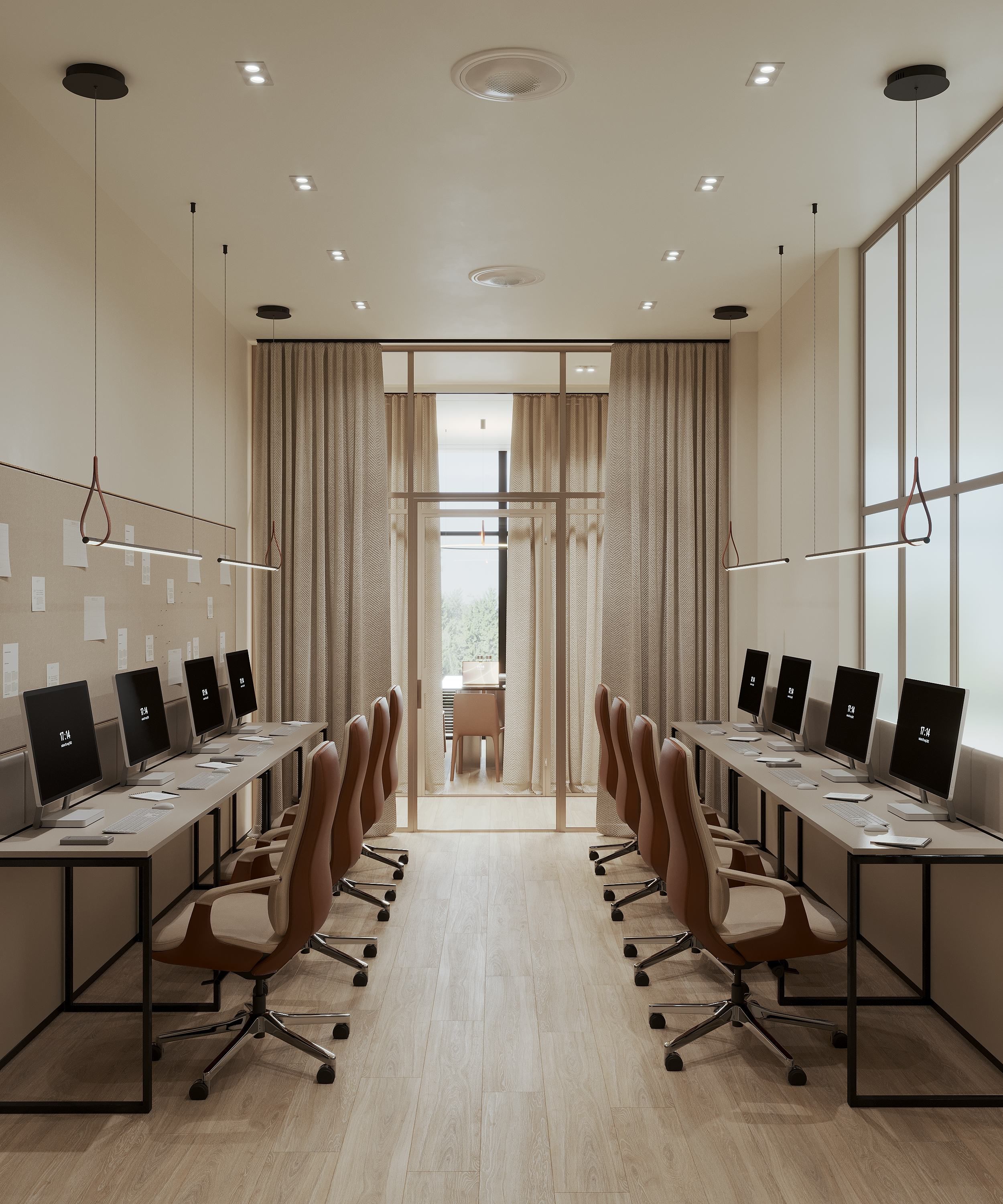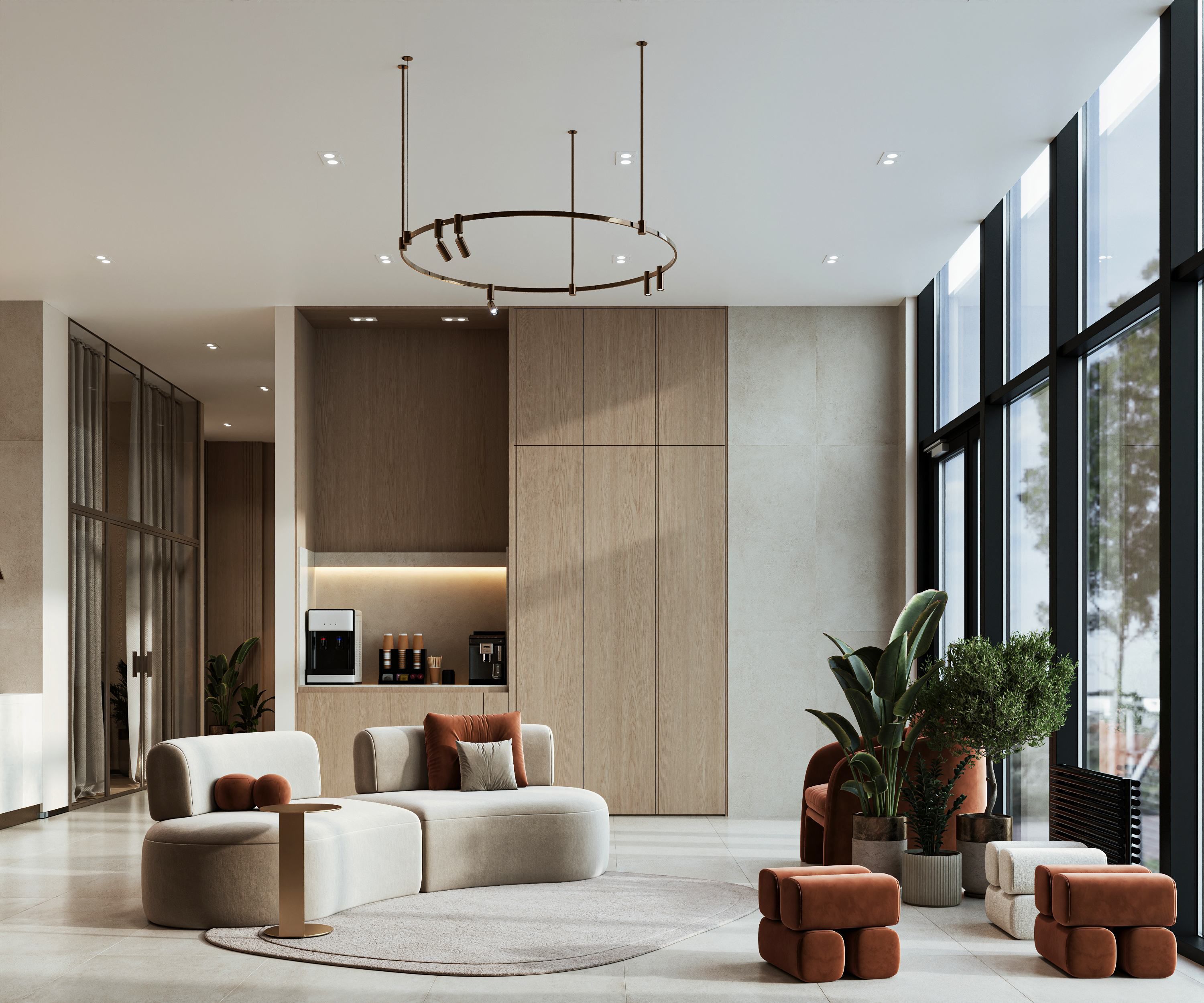 Отправной точкой концепции стал дизайн МОП ЖК «Грейд», где уже заложены черты минимализма и элементы айдентики компании. Это позволило создать визуальную преемственность между жилым комплексом и пространством офиса продаж. Сдержанная цветовая гамма дополнена акцентами терракотового оттенка в текстиле и металлизированными деталями, что придает интерьеру теплоту и характер, не нарушая общей лаконичности.