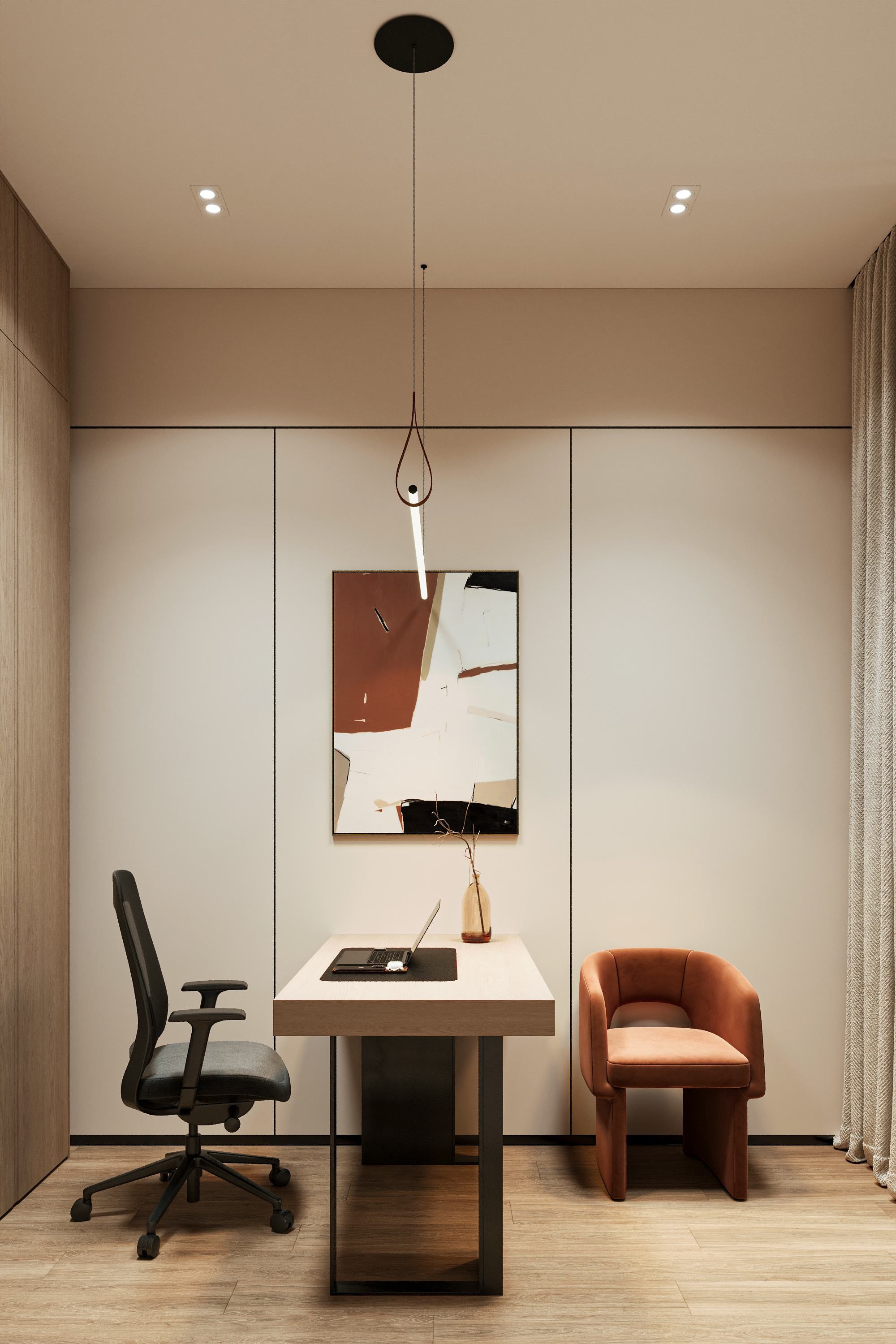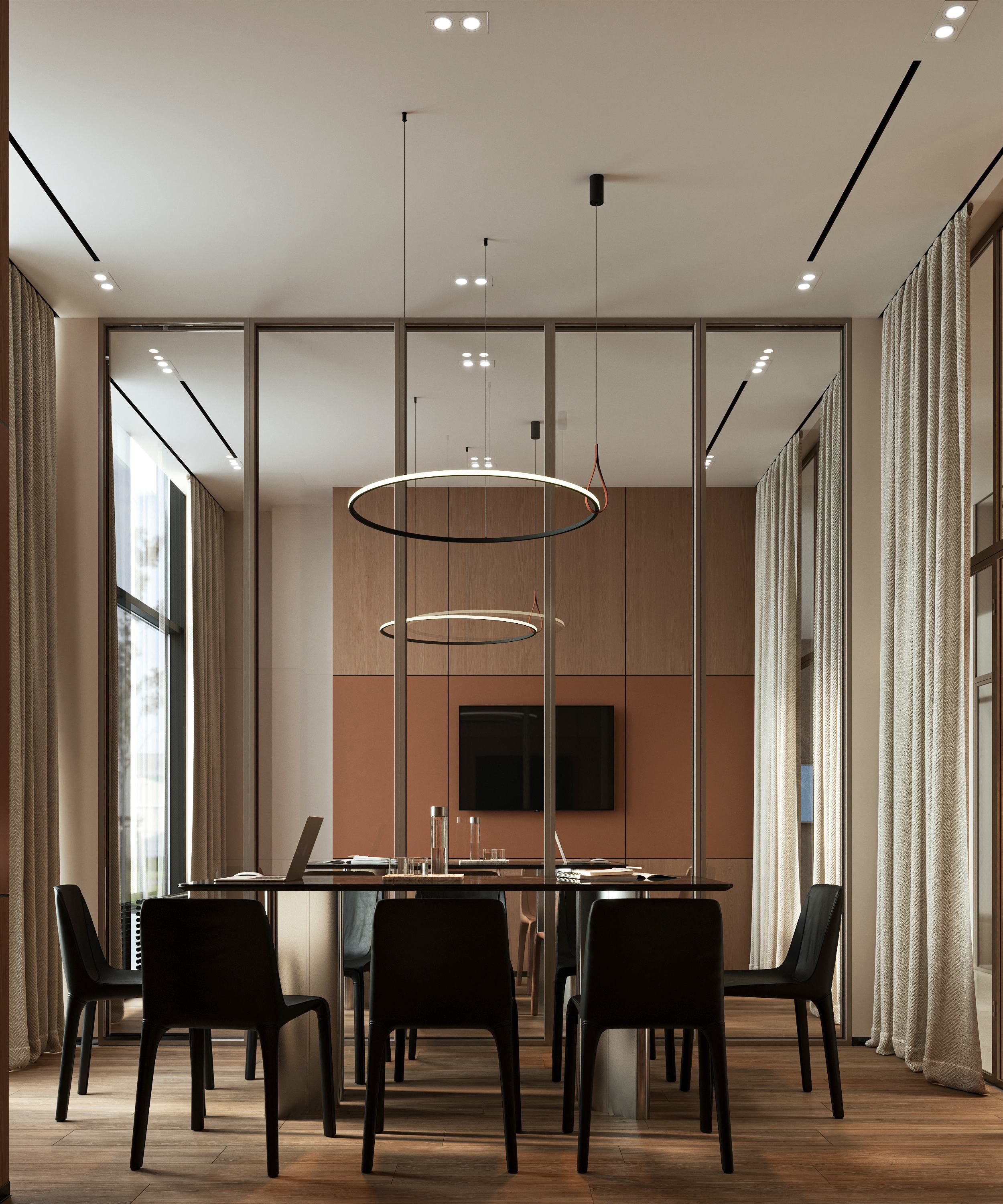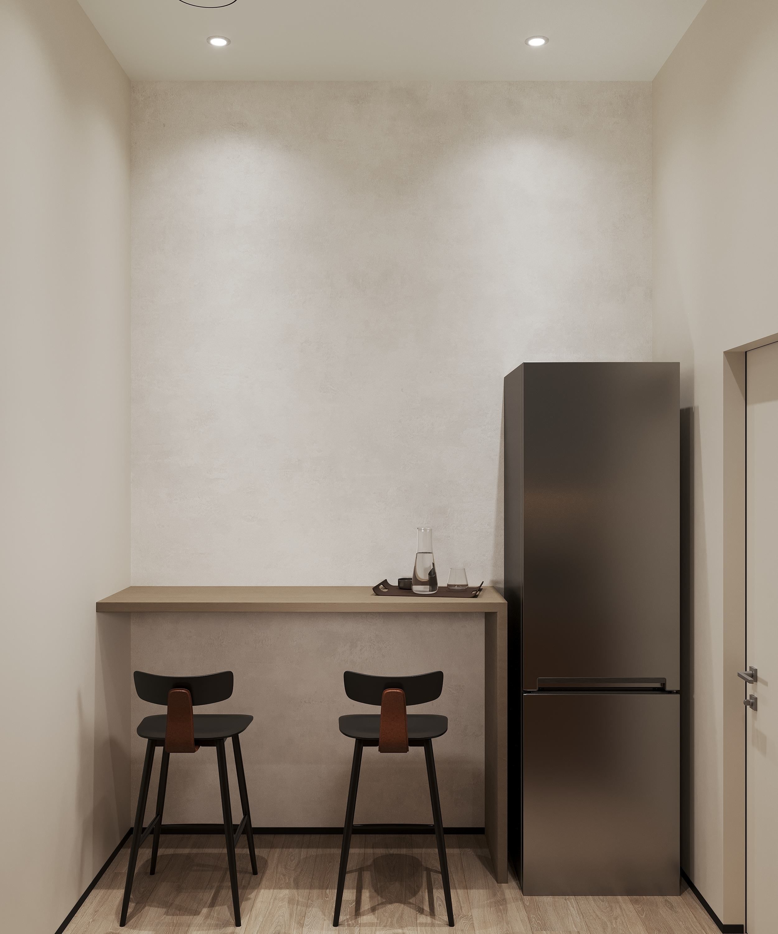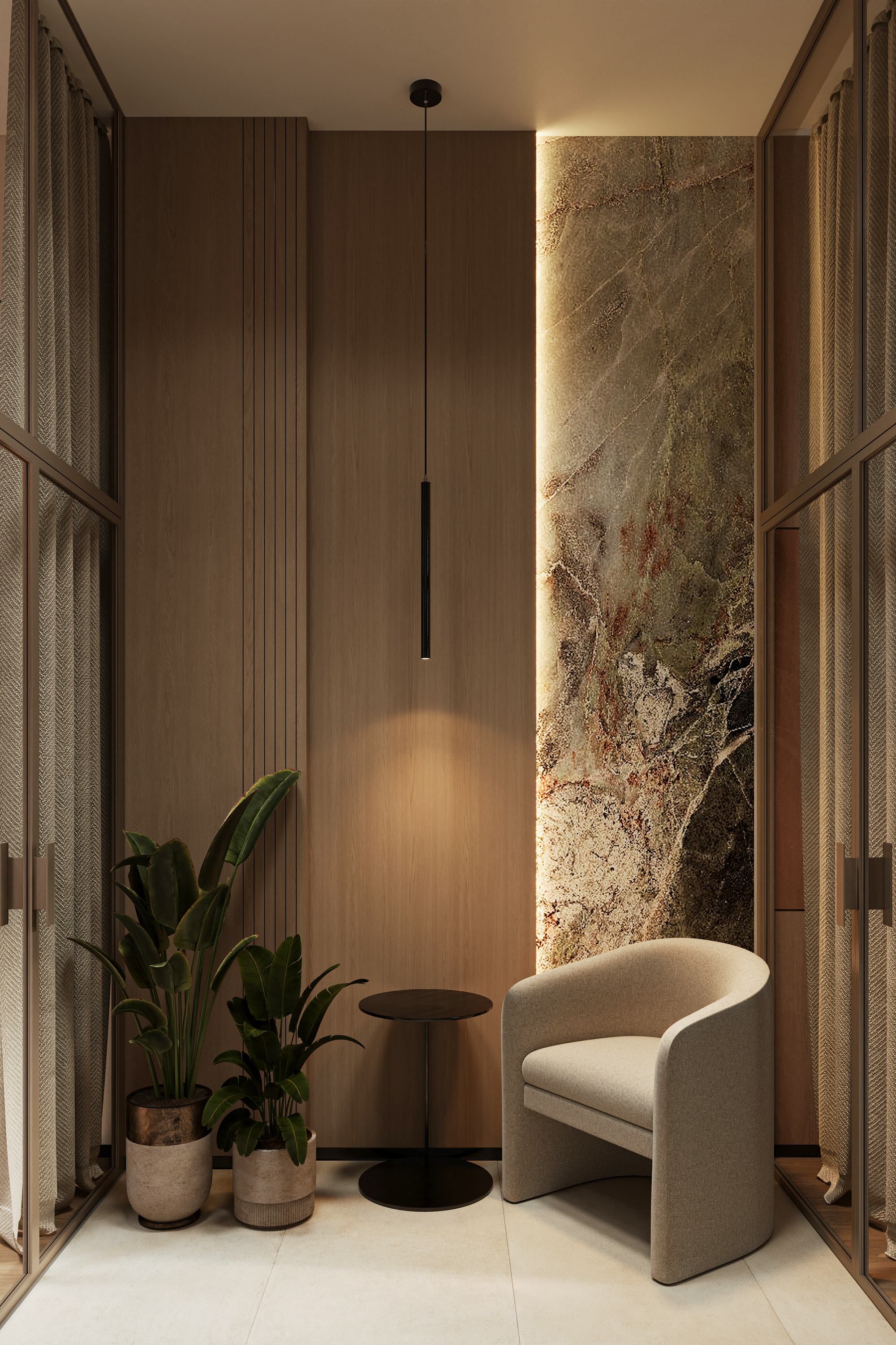 Особое внимание уделено материалам и фактурам: тактильно приятные поверхности, качественная отделка и деликатные акценты подчеркивают статус пространства. Продуманная пространственная организация обеспечивает удобную навигацию и логичное зонирование, сохраняя ощущение открытости и воздуха.