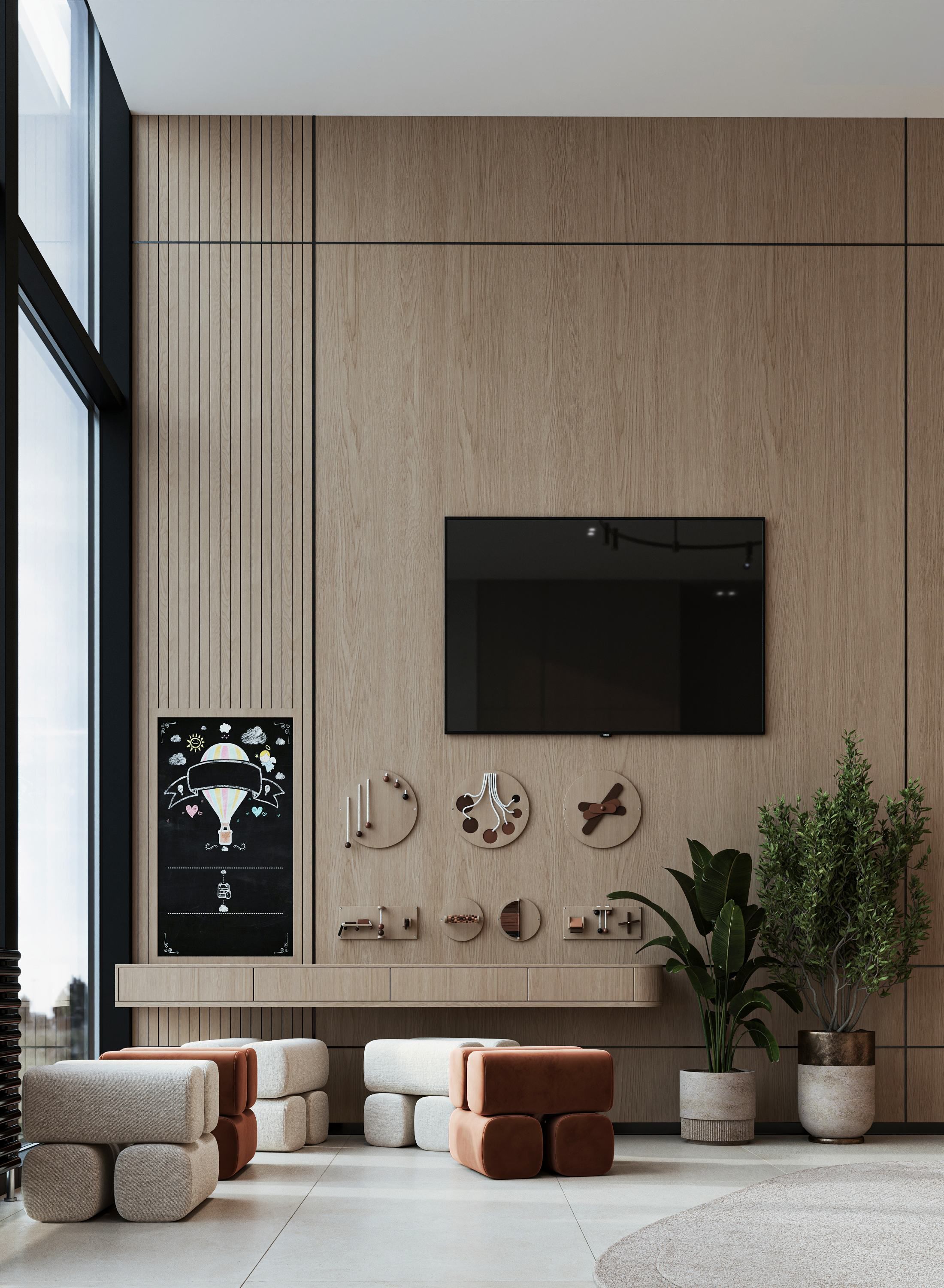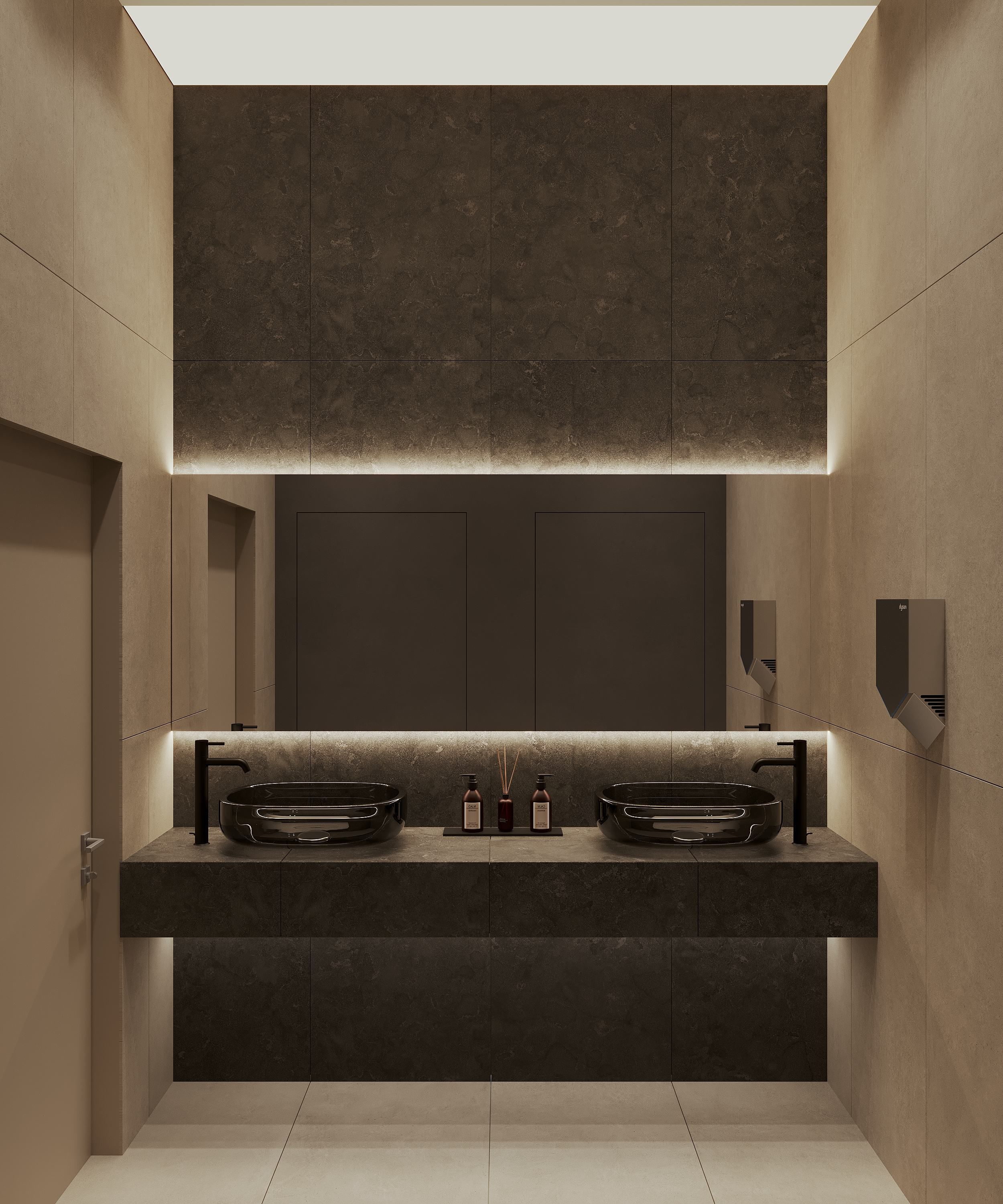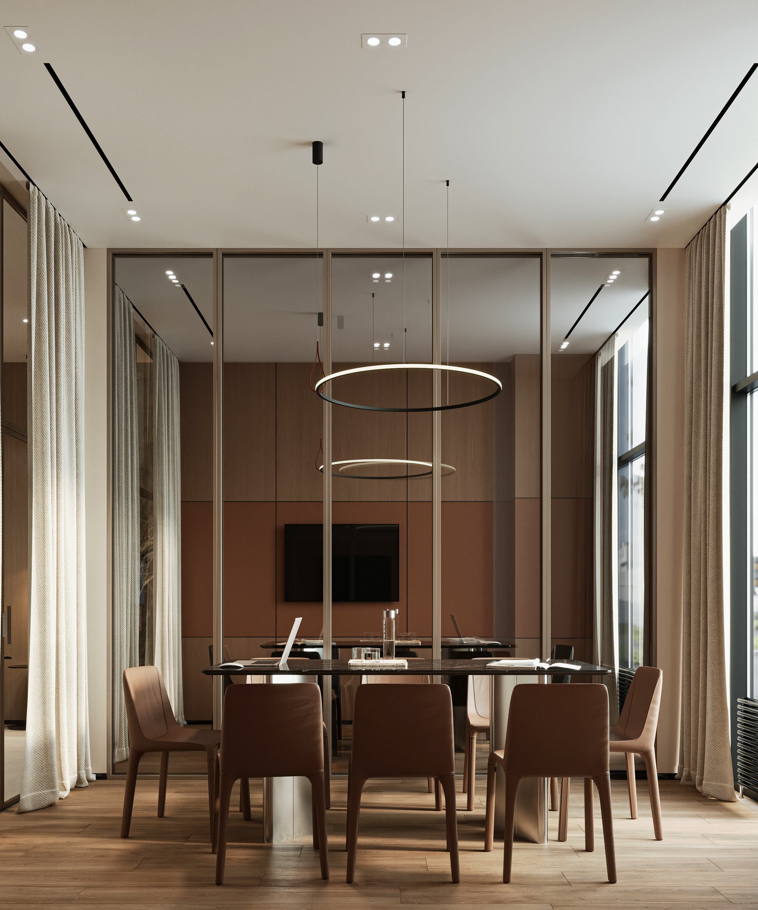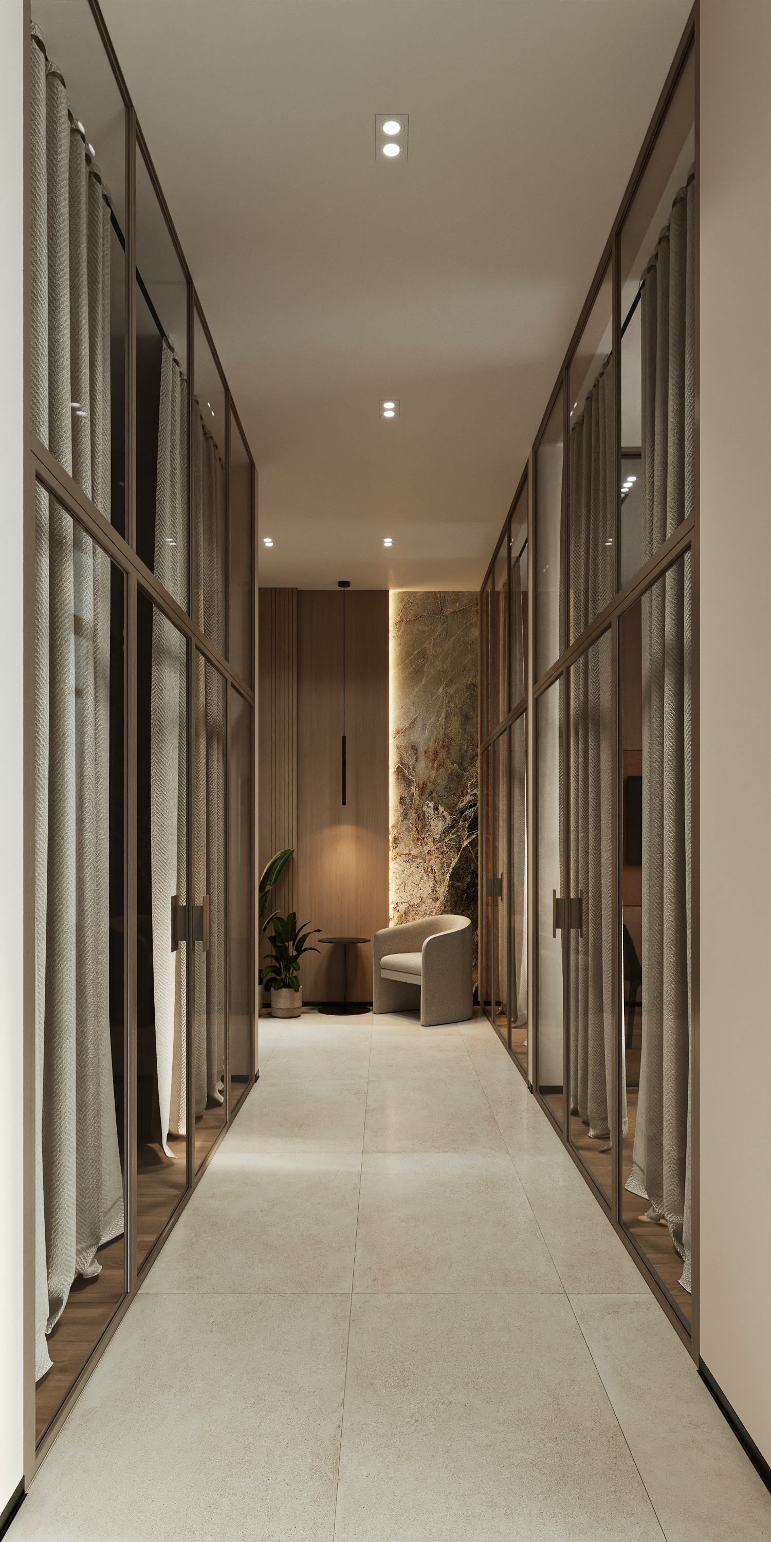 Особое внимание уделено материалам и фактурам: тактильно приятные поверхности, качественная отделка и деликатные акценты подчеркивают статус пространства. Продуманная пространственная организация обеспечивает удобную навигацию и логичное зонирование, сохраняя ощущение открытости и воздуха.