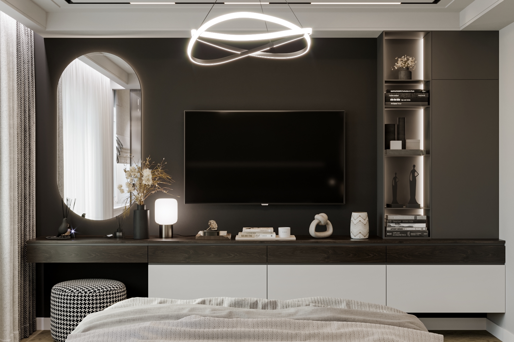 Единственный способ сделать такую гардеробную – это урезать площадь спальни вглубь помещения и соорудить стену прямо за изголовьем двуспальной кровати. Вариант более чем удобный даже для однокомнатных квартир, ведь никаких серьезных работ по возведению стен не потребуется.