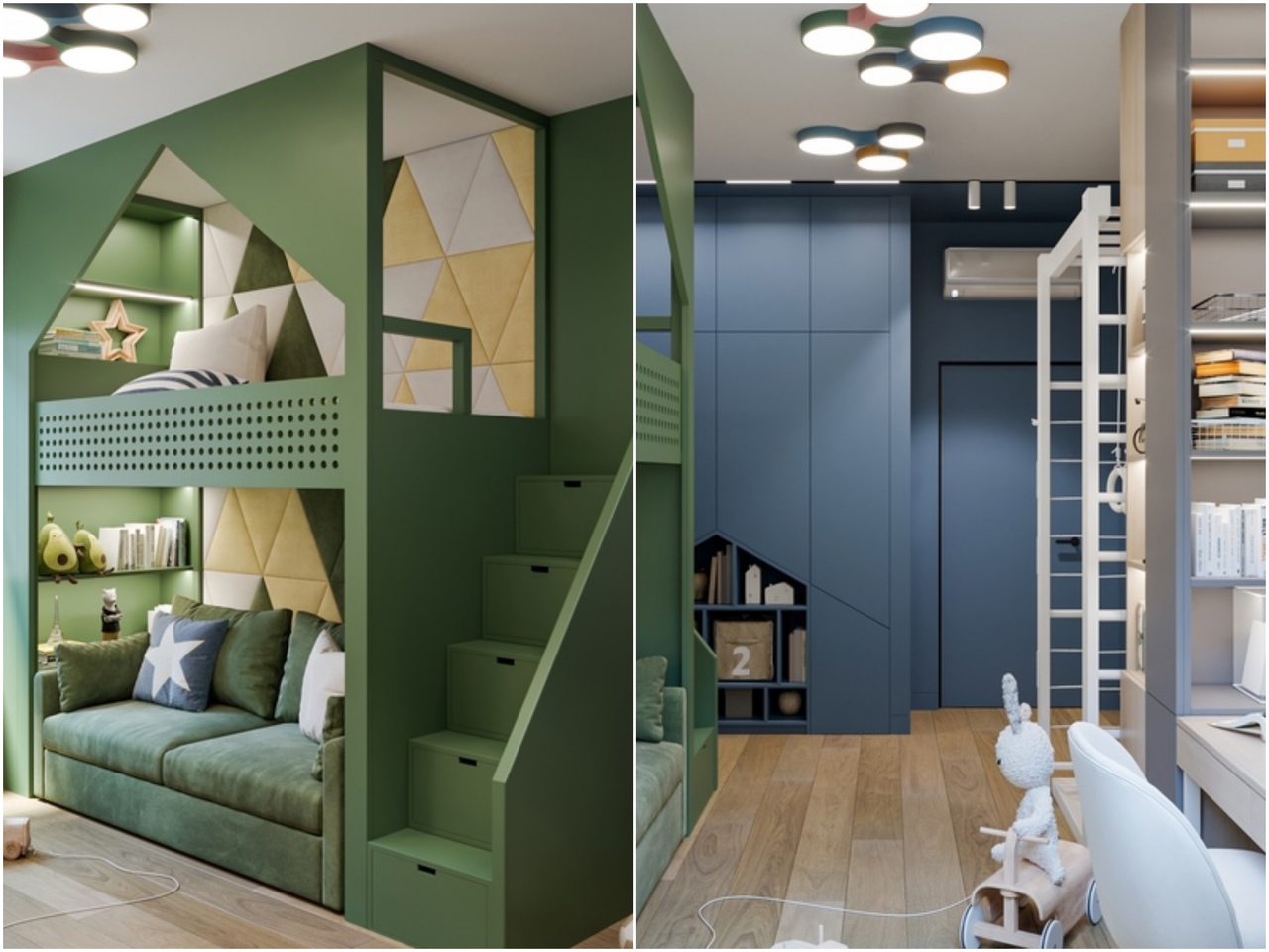 Для детской мы использовали успокаивающие цвета – зеленый и светло-синий. Для двухъярусной кровати наша команда предусмотрела вместо привычной лестницы ступеньки-ящики, в которые можно спрятать игрушки и другие предметы. Комната разделена на зоны – рабочее и спальное место, а также шведская стенка для активных игр.