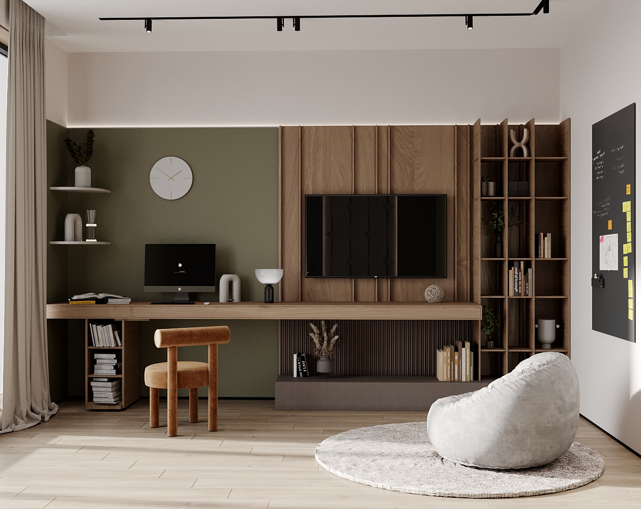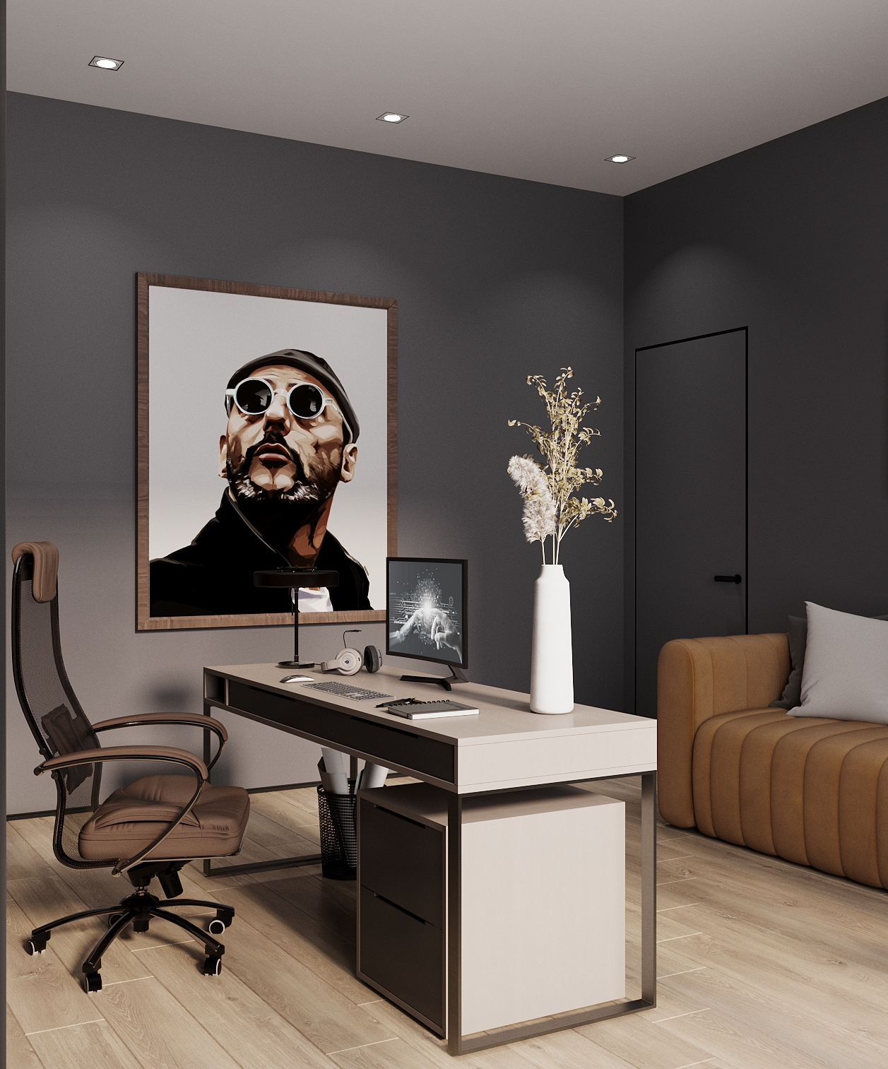 Кабинет пропитан насыщенными оттенками, которые воссоздают обстановку уединения, необходимую для эффективной работы. Брутальный и стильный дизайн подчёркивает серьёзность и важность рабочей зоны, а также обеспечивает комфортное пространство для выполнения любых задач. Здесь всё направлено на создание рабочей обстановки, где ничто не будет отвлекать от важных дела.