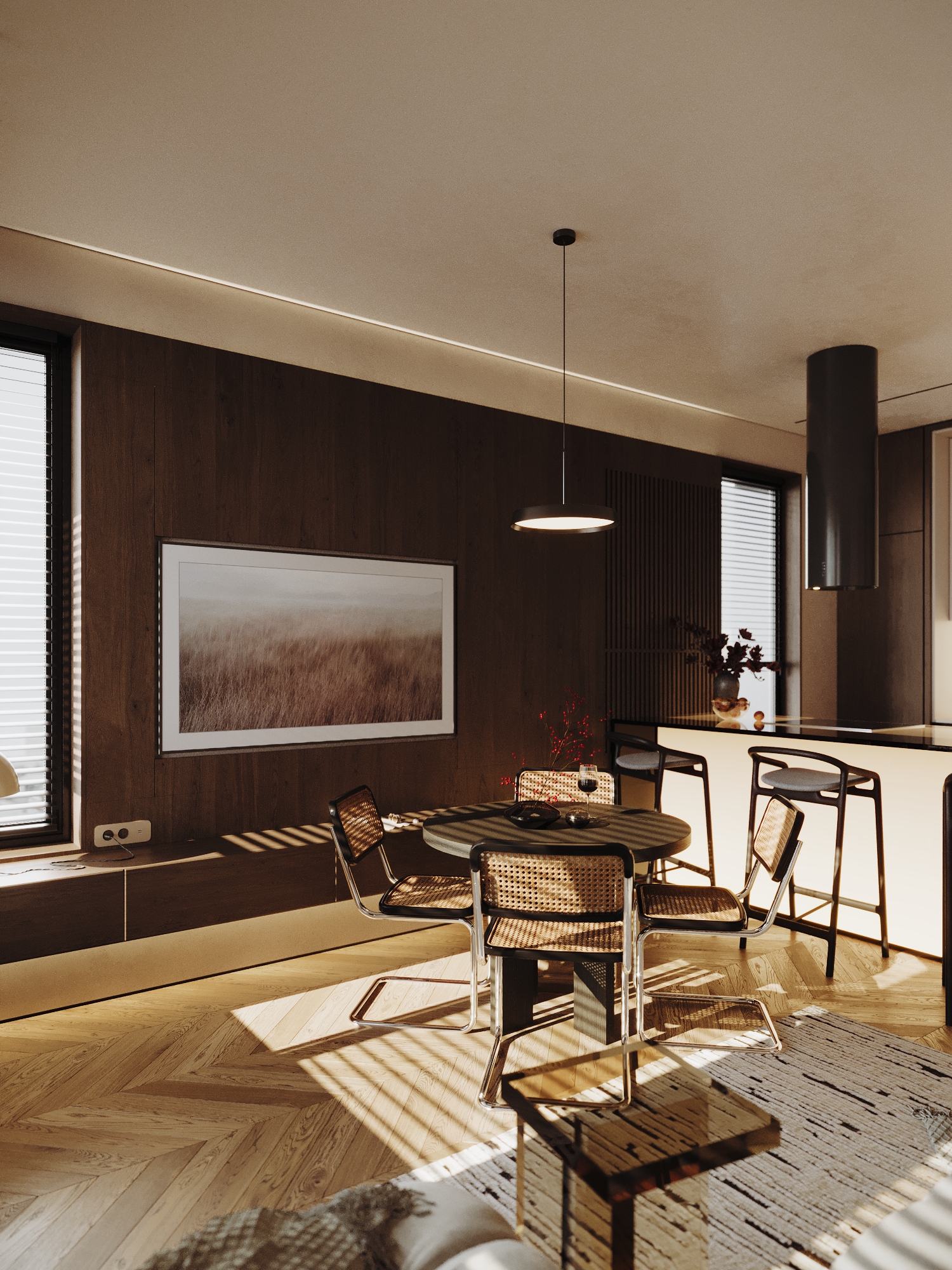 Центром композиции стал остров с мягкой подсветкой, наполняющей пространство теплом. Лаконичные барные стулья на металлических опорах поддерживают визуальную лёгкость и воздушность интерьера. Пол выложен паркетом «ёлочкой» из натурального дуба, который задаёт ритм и добавляет пространству графичности.