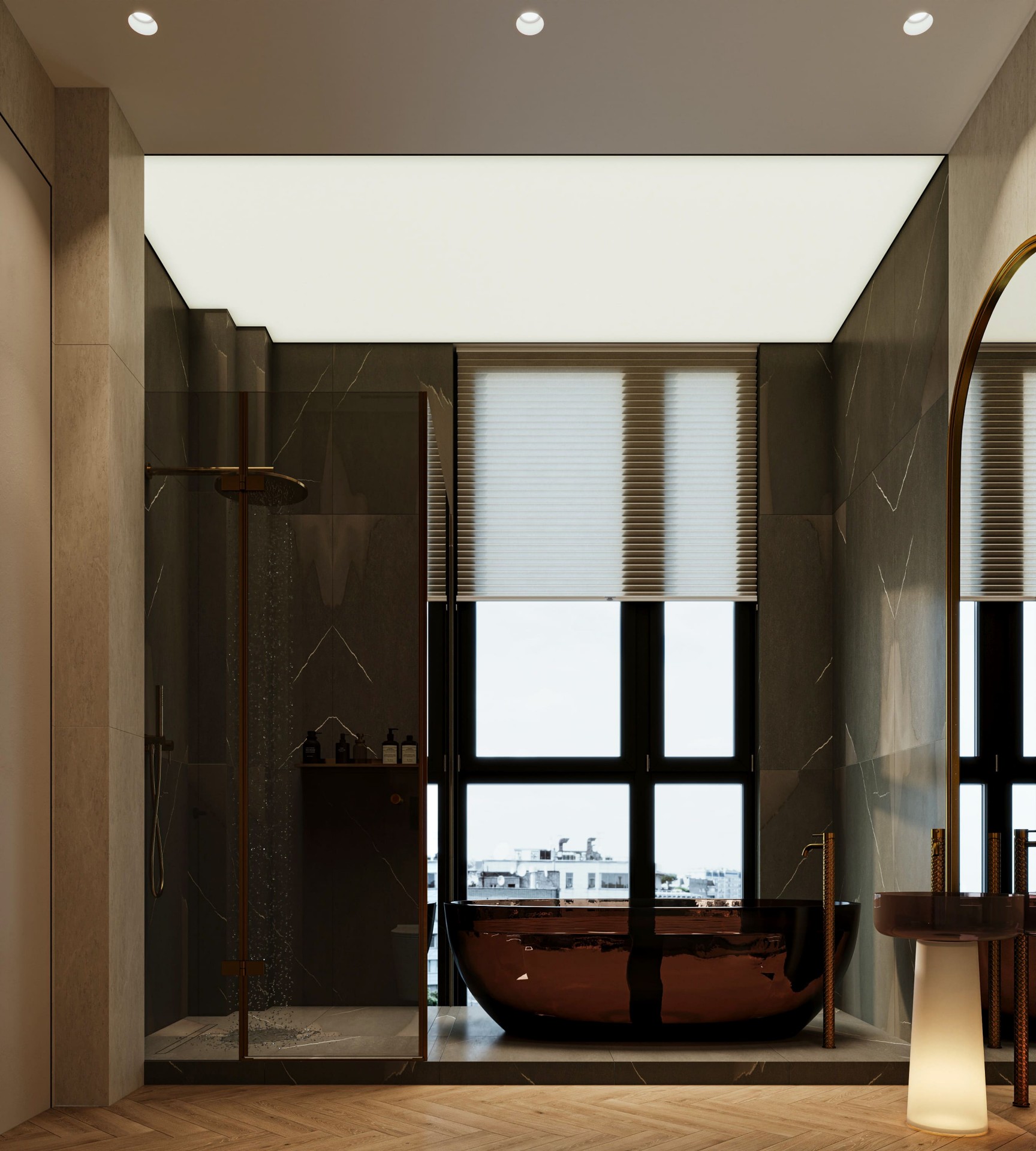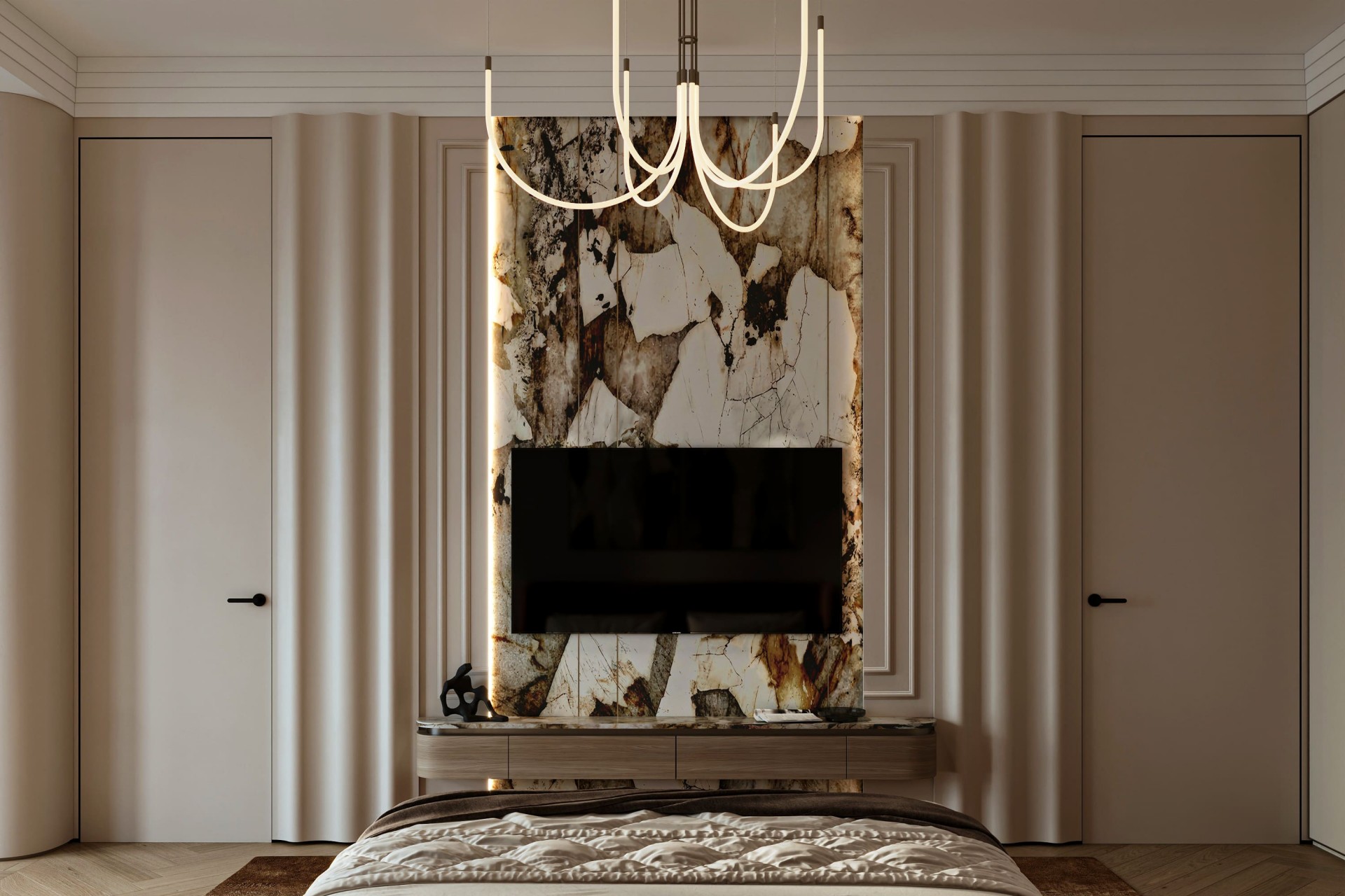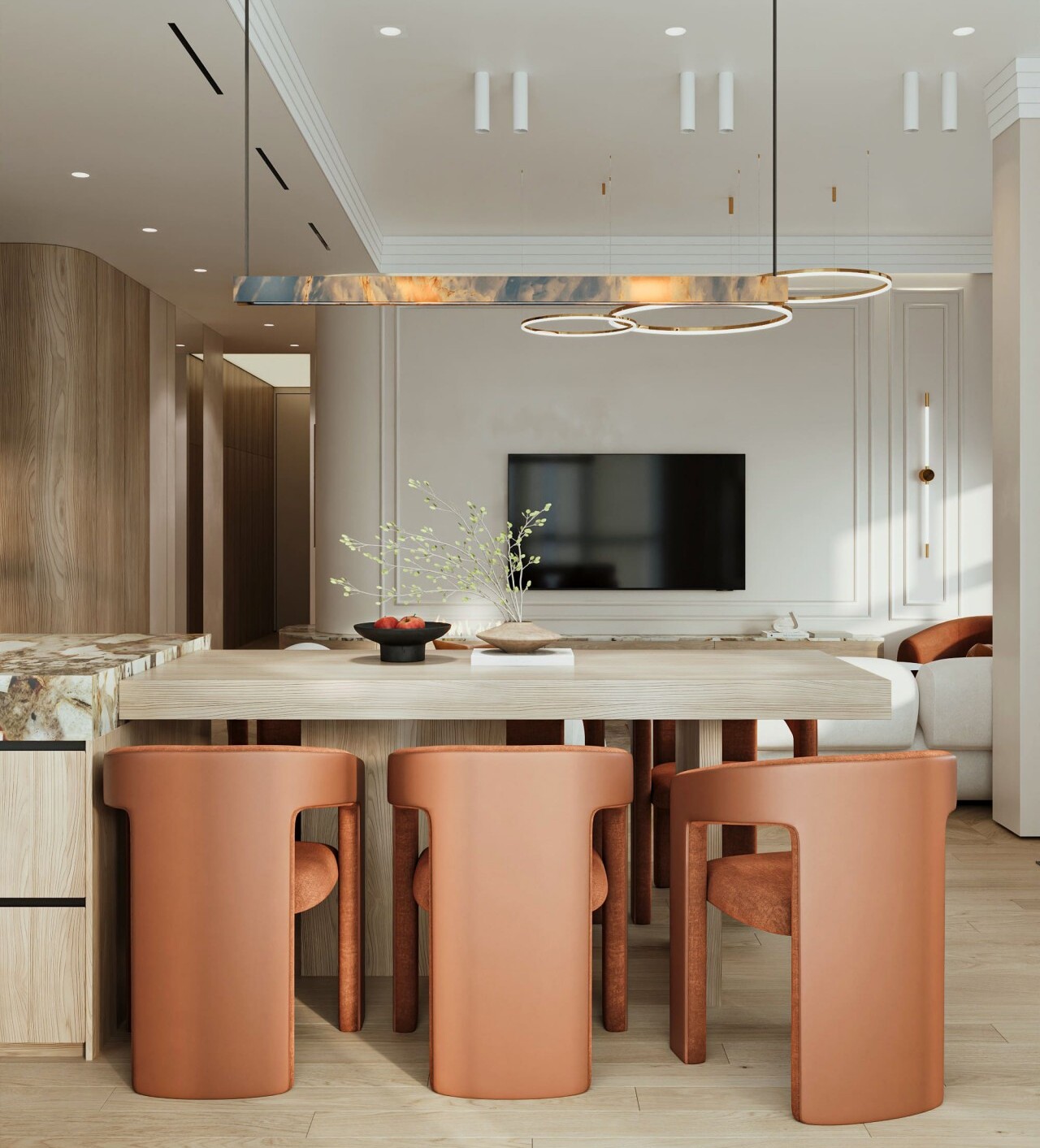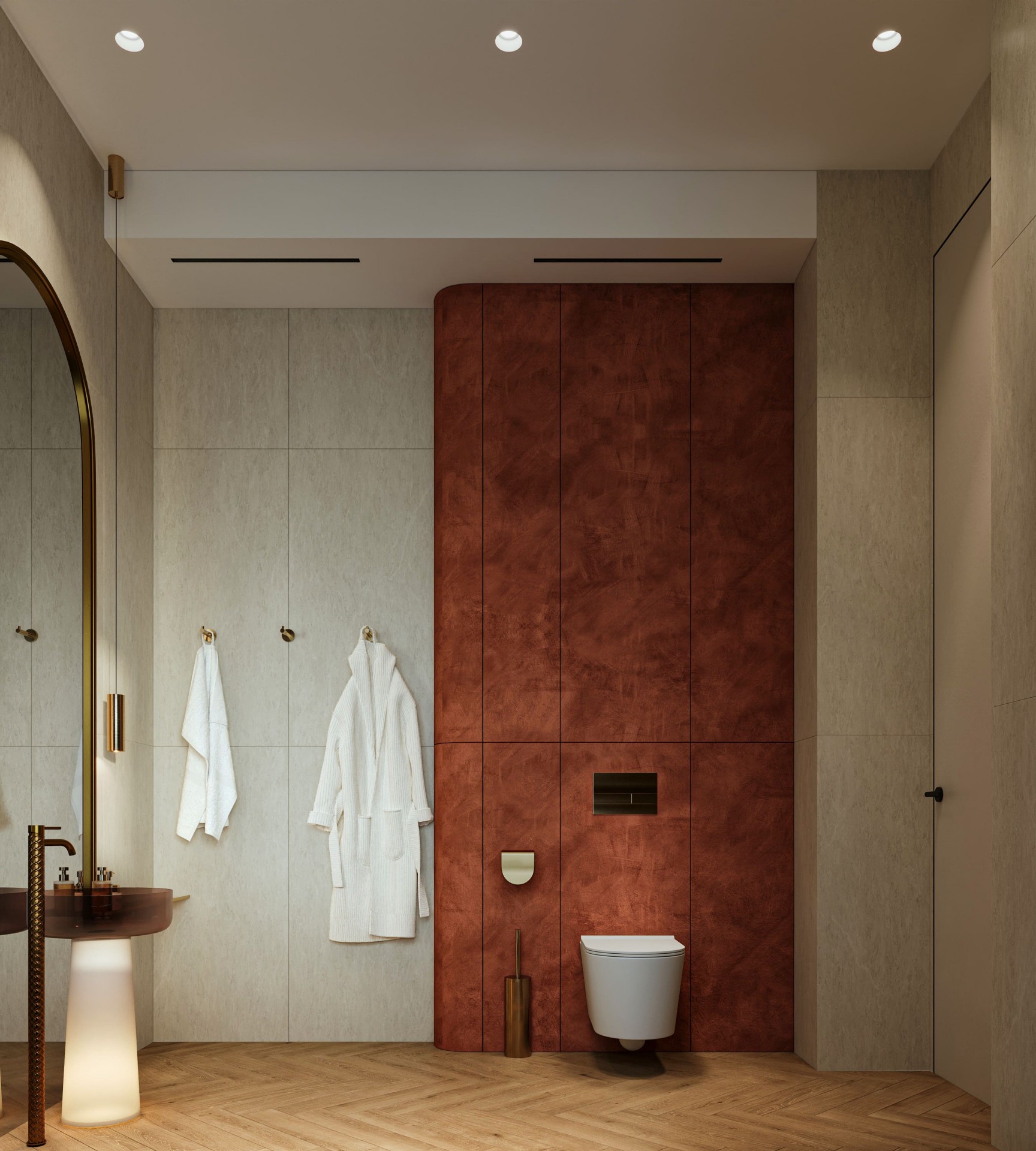 Главная концепция — современный дизайн с акцентами арт-деко, отражающими премиальную стилистику комплекса. В основе лежат натуральные материалы: инженерная доска, мебель из шпона, элементы кухни, выполненные из натурального камня. Плавные линии и мягкие формы создают ощущение комфорта: скруглённые углы стен и мебели подчеркивают гармонию пространства.
