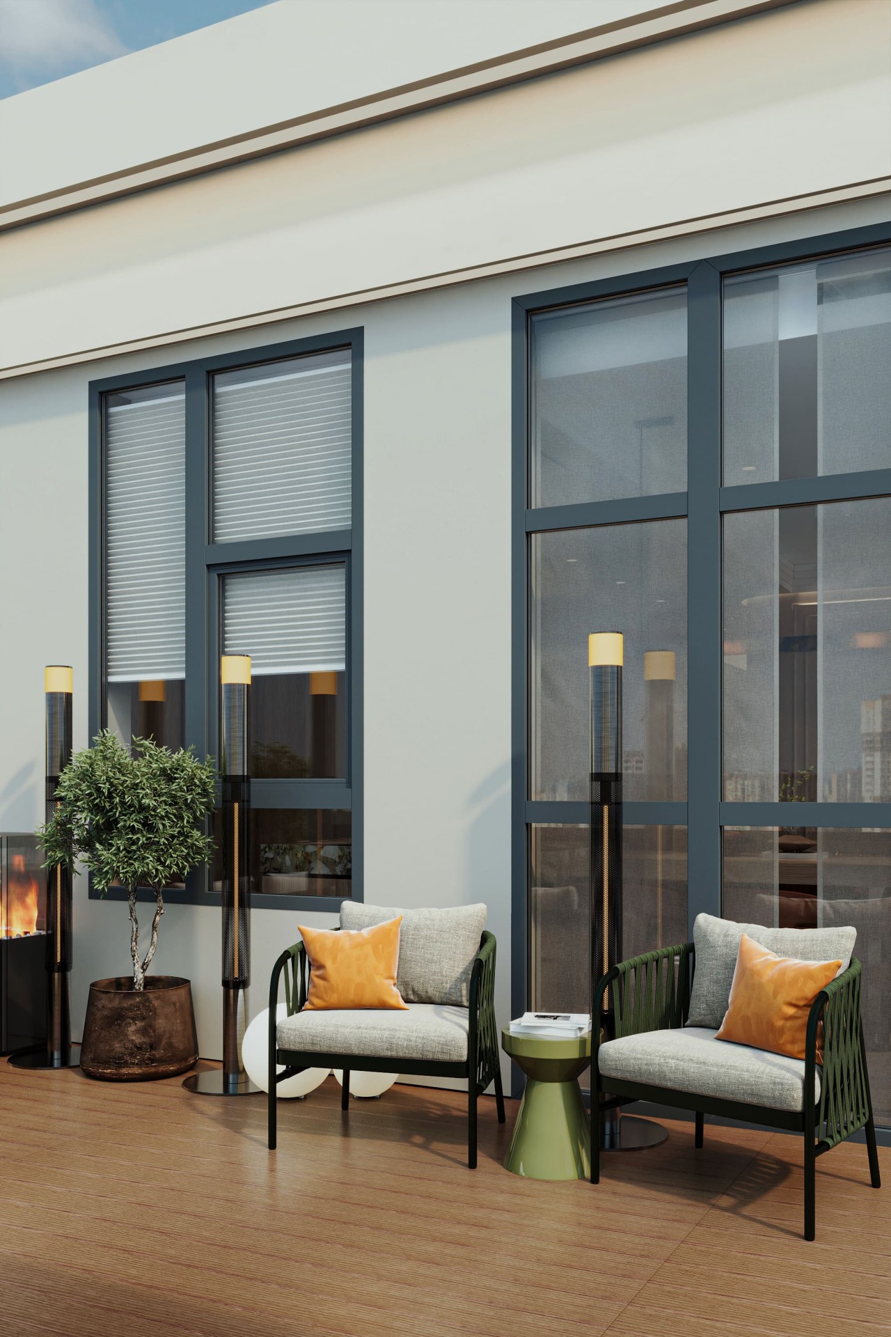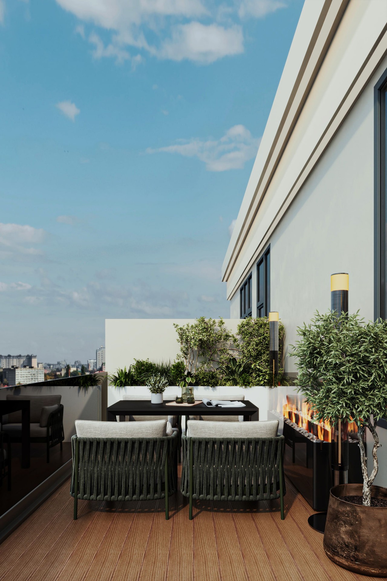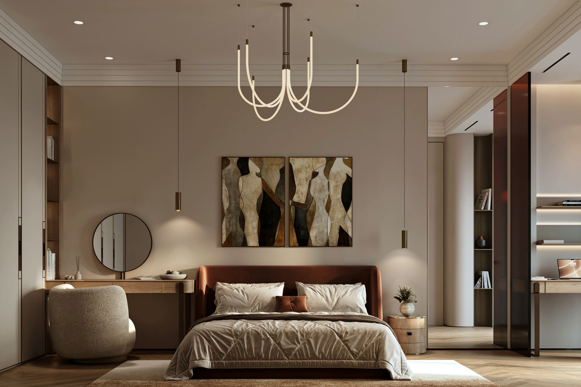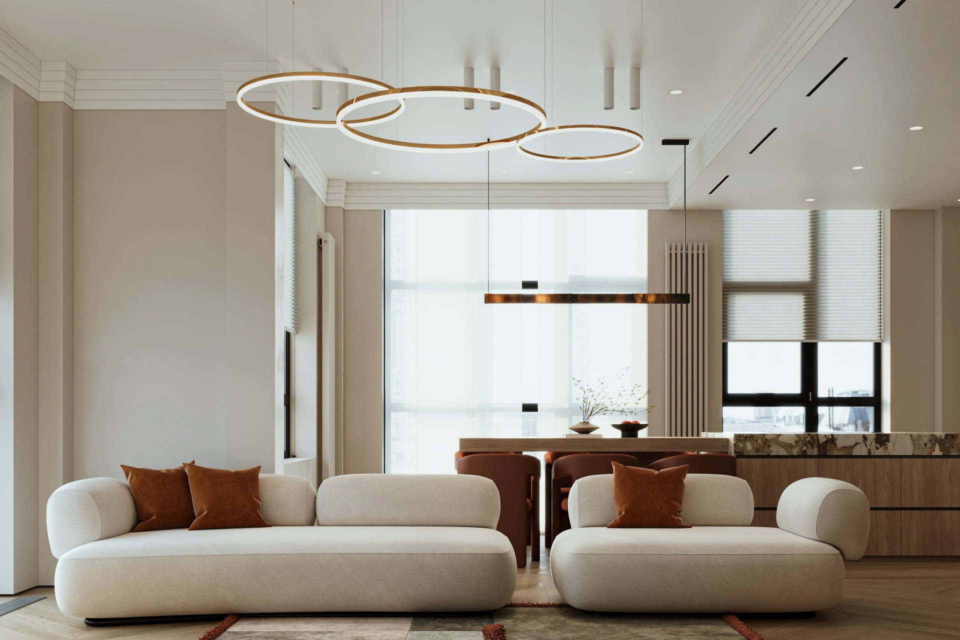 Главная концепция — современный дизайн с акцентами арт-деко, отражающими премиальную стилистику комплекса. В основе лежат натуральные материалы: инженерная доска, мебель из шпона, элементы кухни, выполненные из натурального камня. Плавные линии и мягкие формы создают ощущение комфорта: скруглённые углы стен и мебели подчеркивают гармонию пространства.